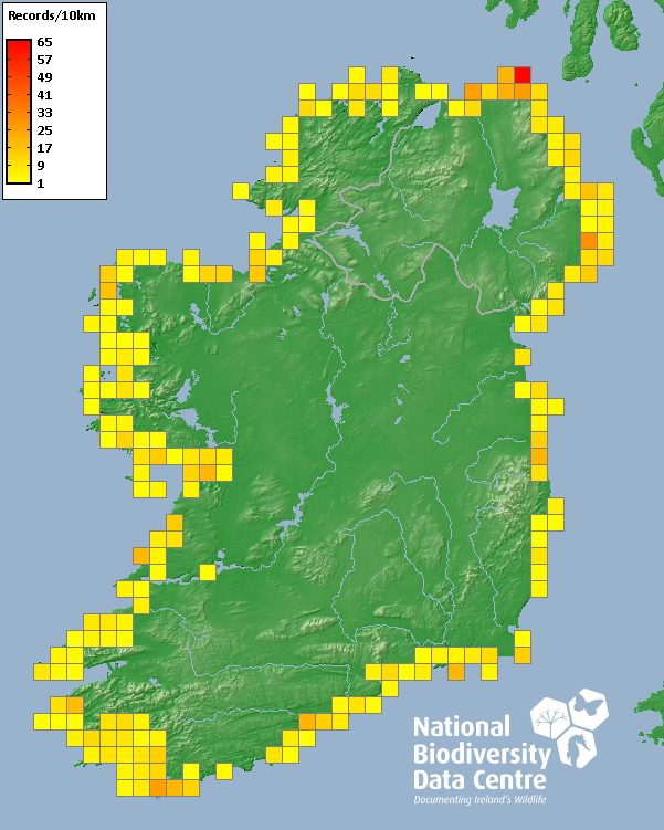 Distribution of the number of records recorded within each 10km grid square (ITM).Marine Map - 50km