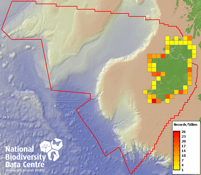 Distribution of the number of records recorded within each 10km grid square (ITM).Marine Map - 50km