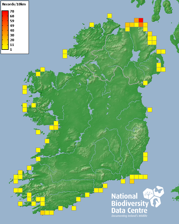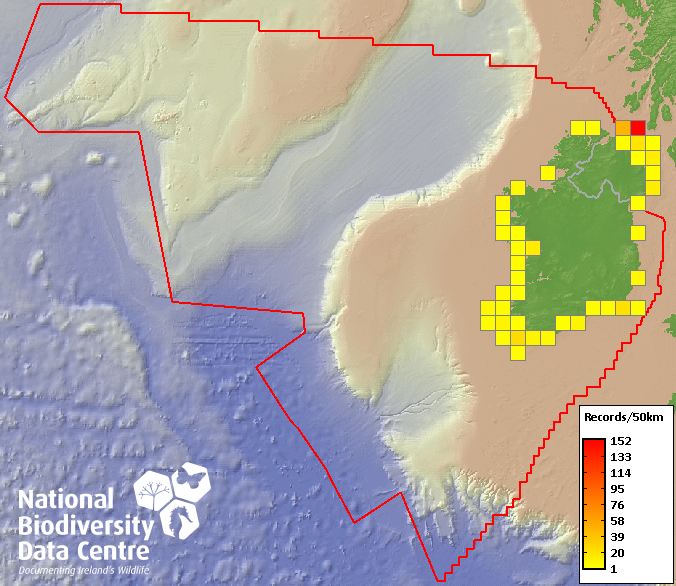 Distribution of the number of records recorded within each 10km grid square (ITM).Marine Map - 50km