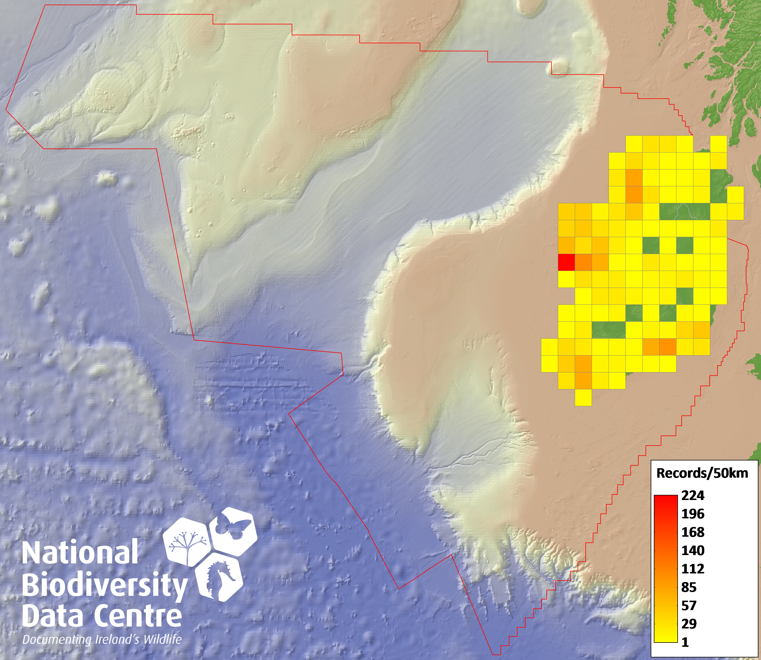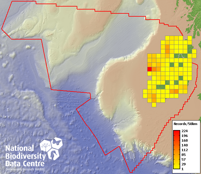 Distribution of the number of records recorded within each 10km grid square (ITM).Marine Map - 50km