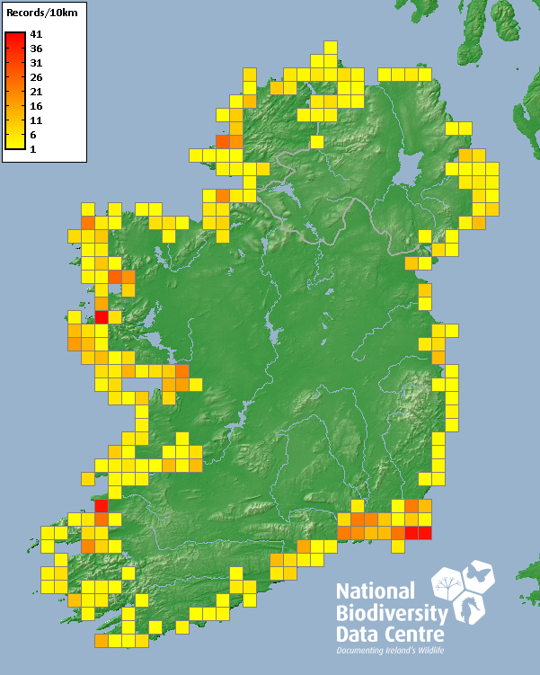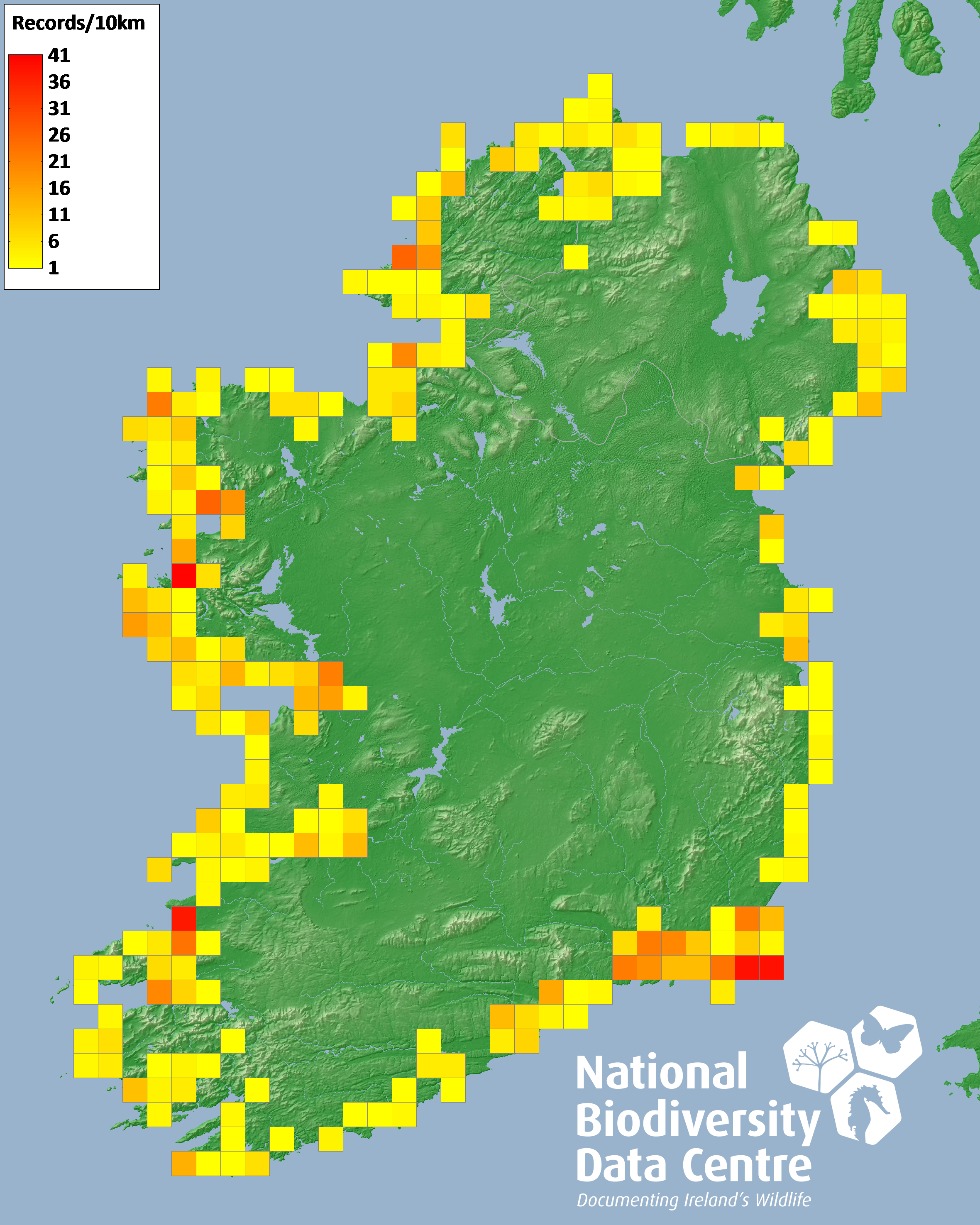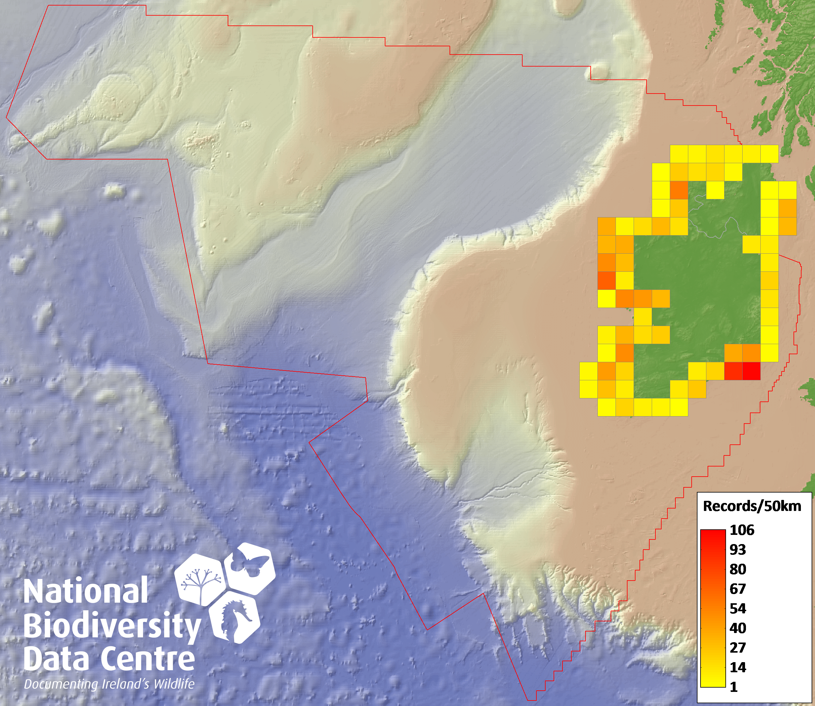 Distribution of the number of records recorded within each 10km grid square (ITM).Marine Map - 50km