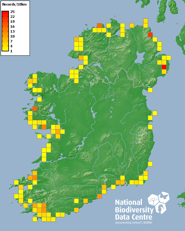 Distribution of the number of records recorded within each 10km grid square (ITM).Marine Map - 50km