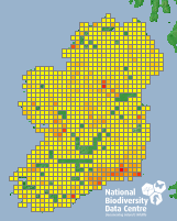 Distribution of the number of records recorded within each 10km grid square (ITM).Marine Map - 50km