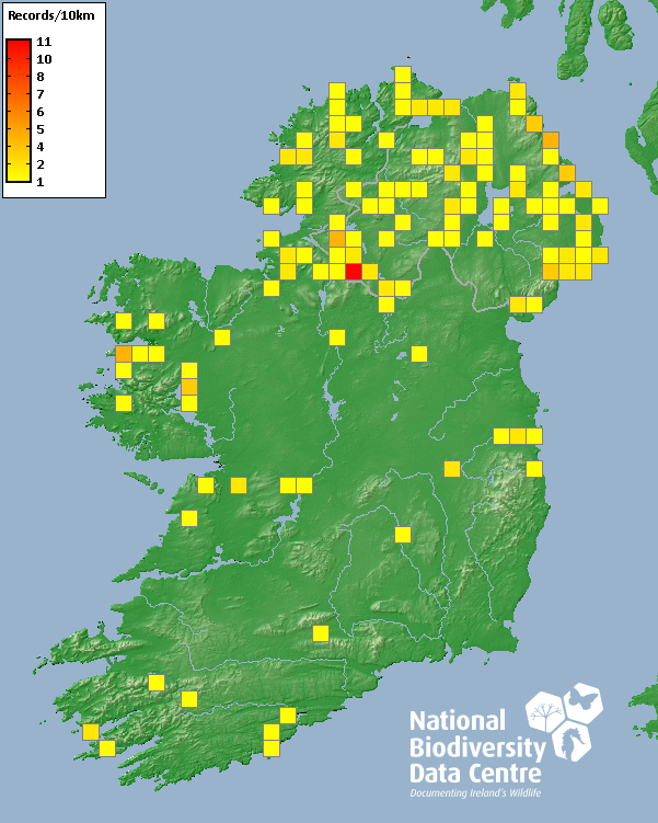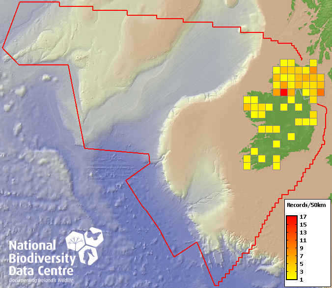 Distribution of the number of records recorded within each 10km grid square (ITM).Marine Map - 50km
