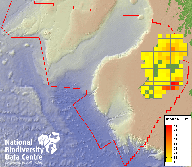 Distribution of the number of records recorded within each 10km grid square (ITM).Marine Map - 50km