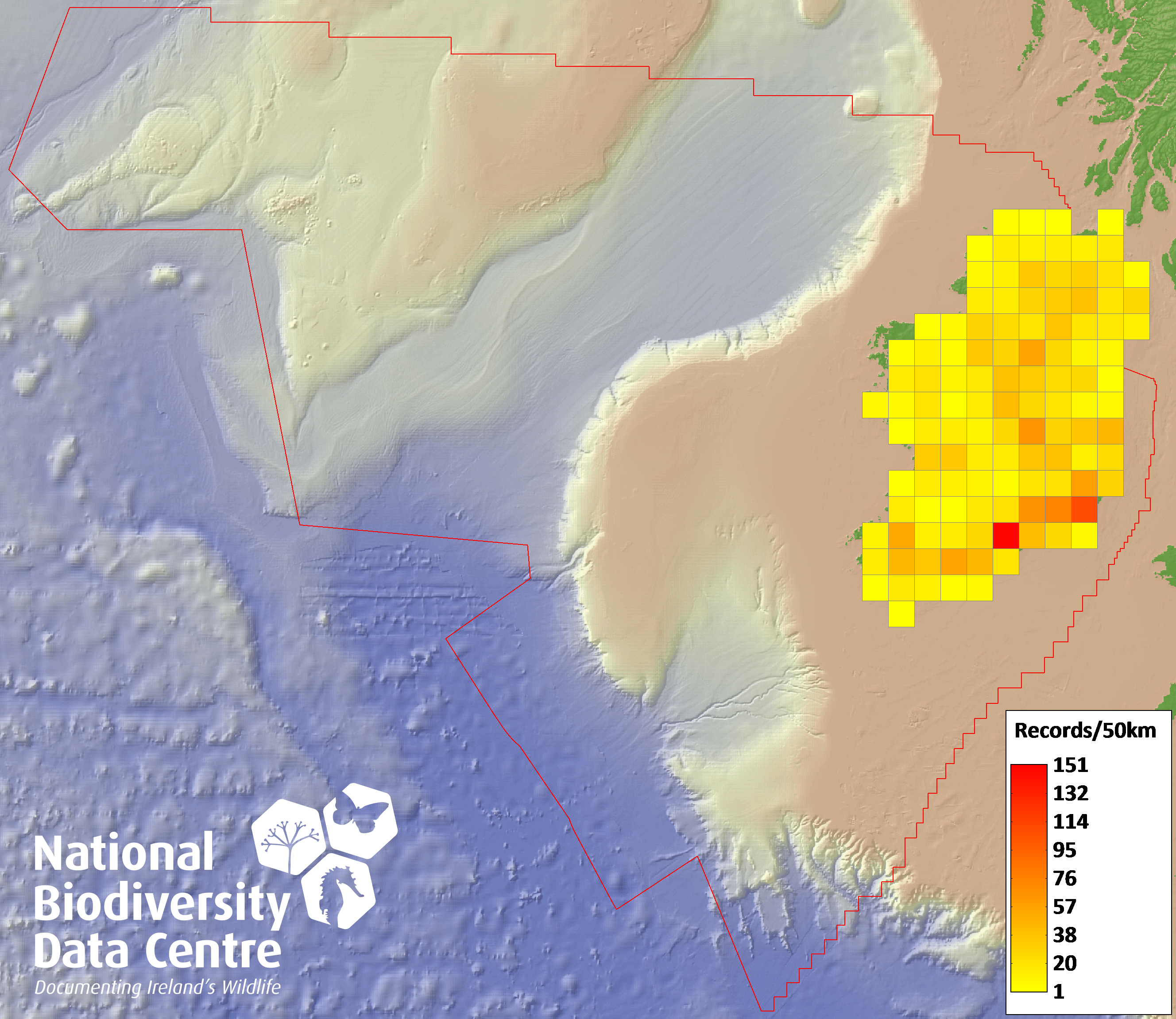 Distribution of the number of records recorded within each 10km grid square (ITM).Marine Map - 50km