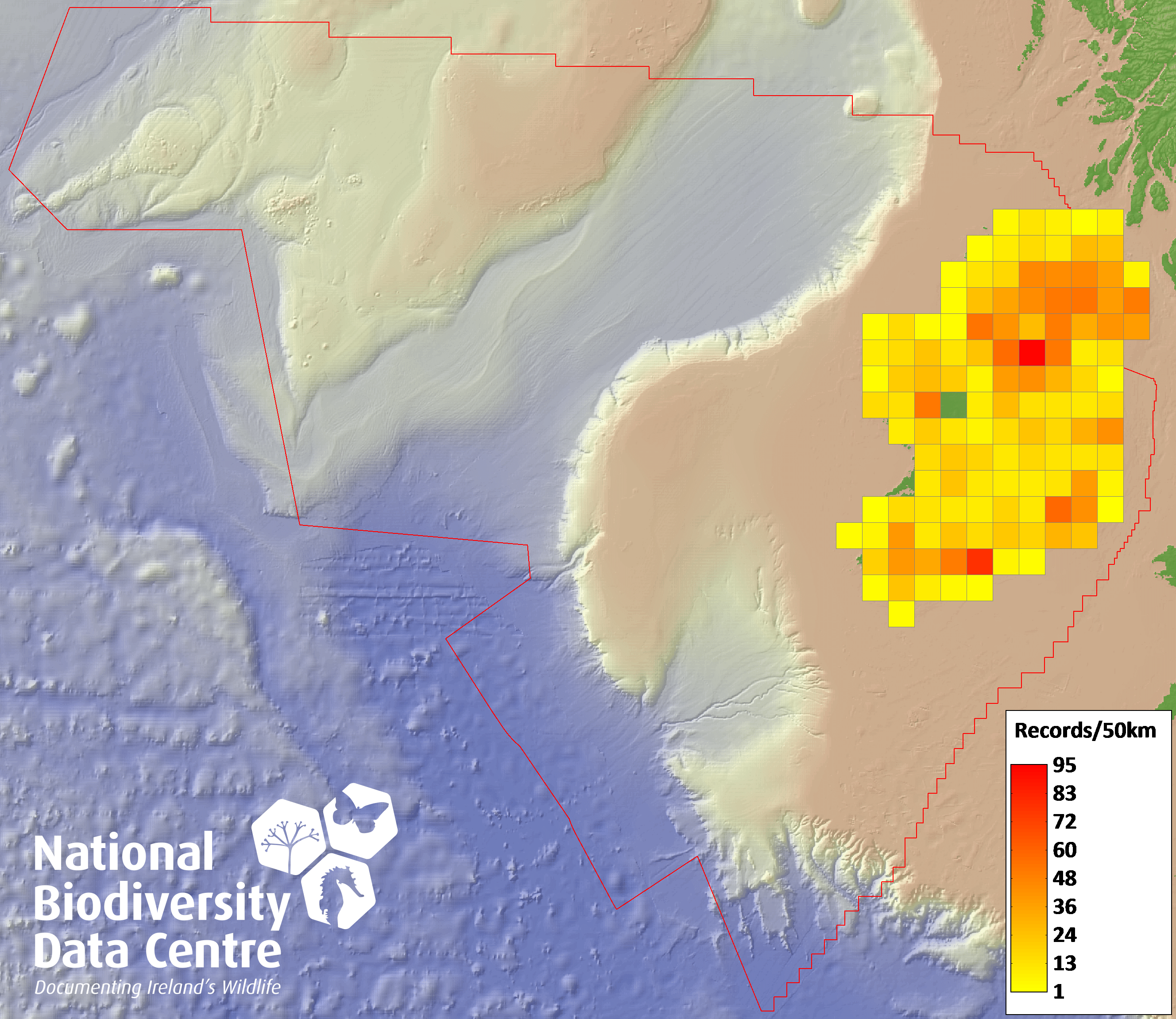 Distribution of the number of records recorded within each 10km grid square (ITM).Marine Map - 50km