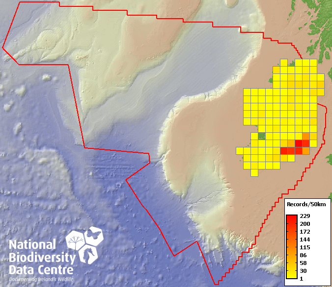 Distribution of the number of records recorded within each 10km grid square (ITM).Marine Map - 50km