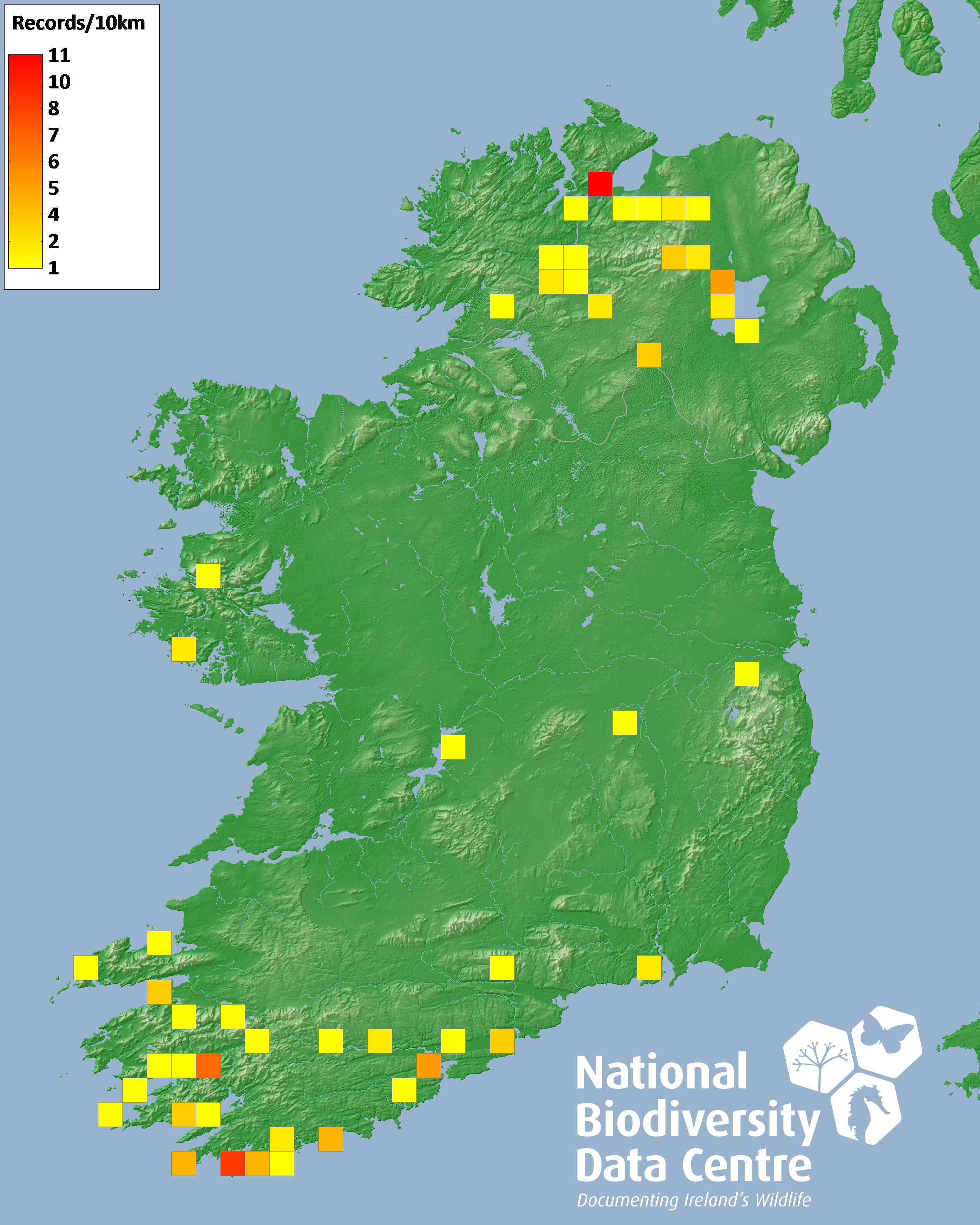 Distribution of the number of records recorded within each 10km grid square (ITM).Marine Map - 50km
