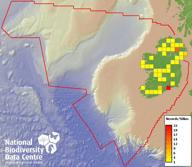 Distribution of the number of records recorded within each 10km grid square (ITM).Marine Map - 50km