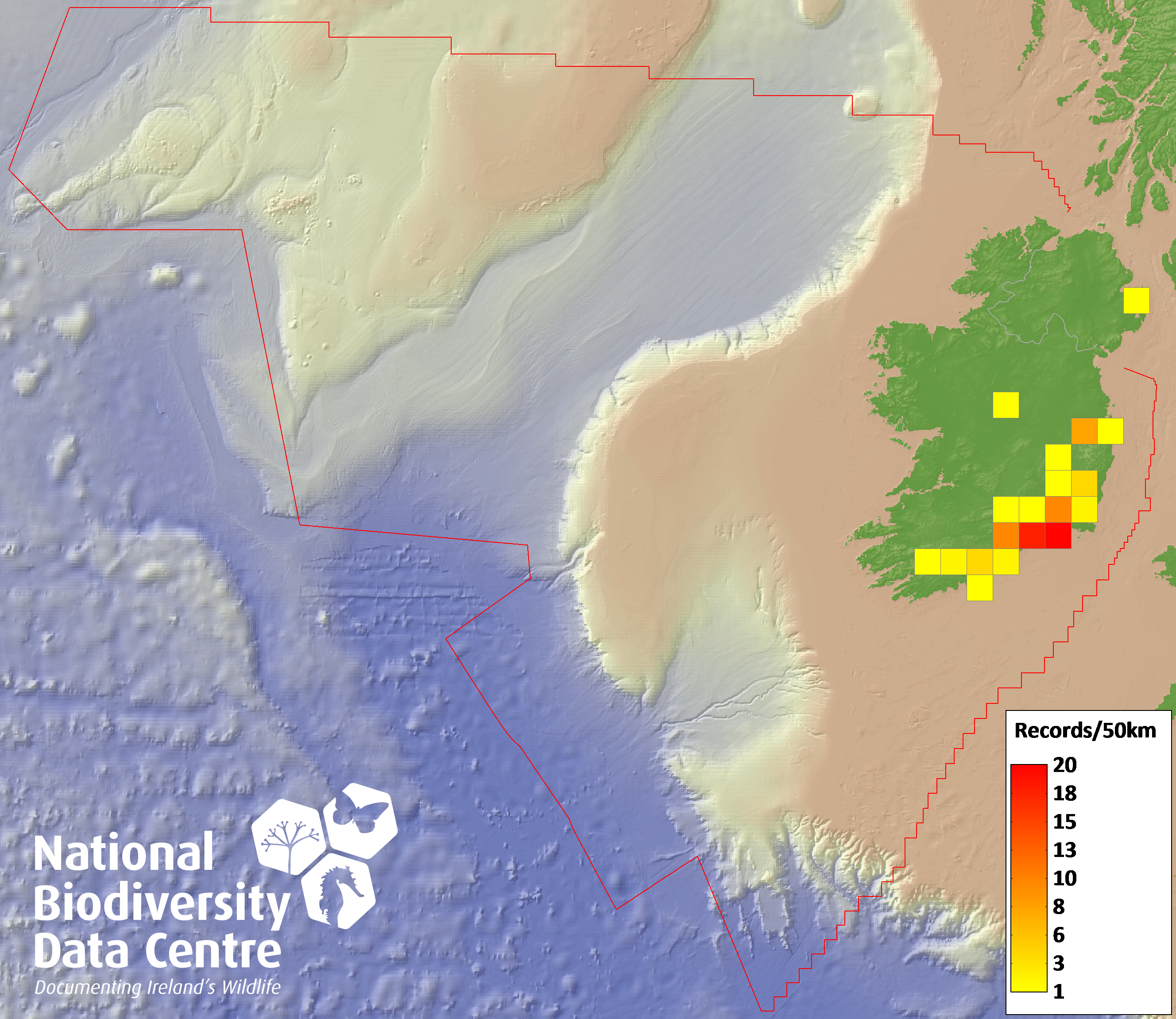 Distribution of the number of records recorded within each 10km grid square (ITM).Marine Map - 50km