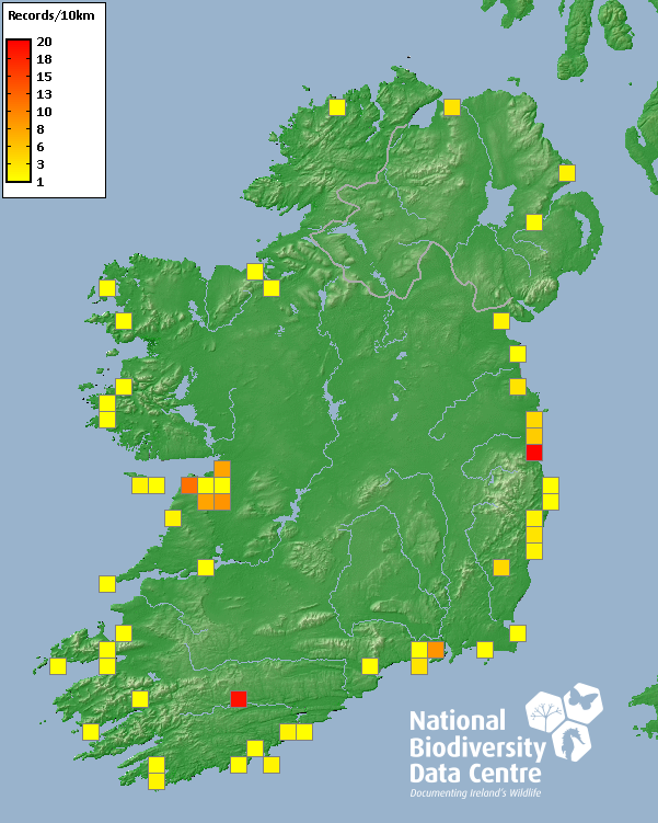 Distribution of the number of records recorded within each 10km grid square (ITM).Marine Map - 50km