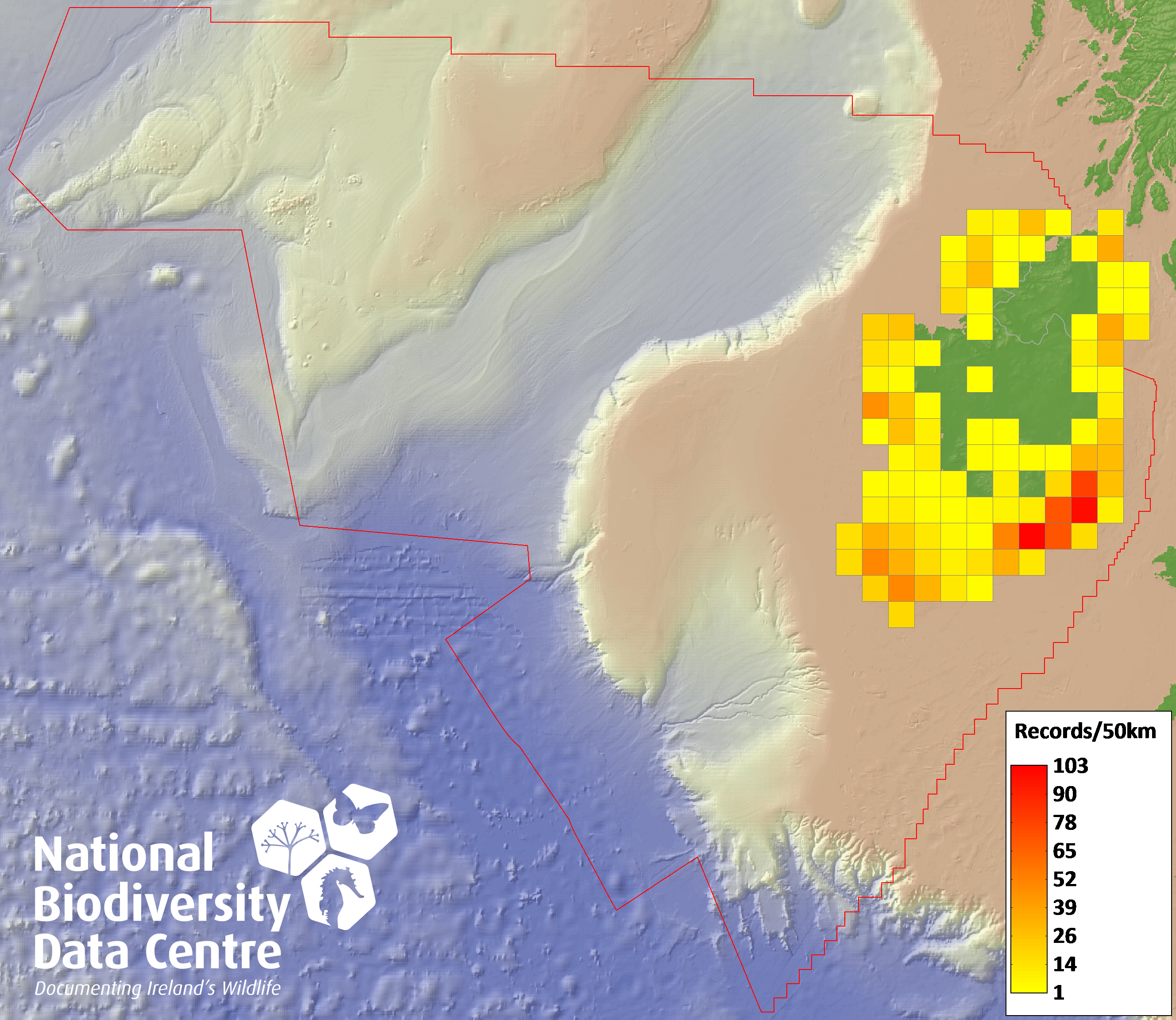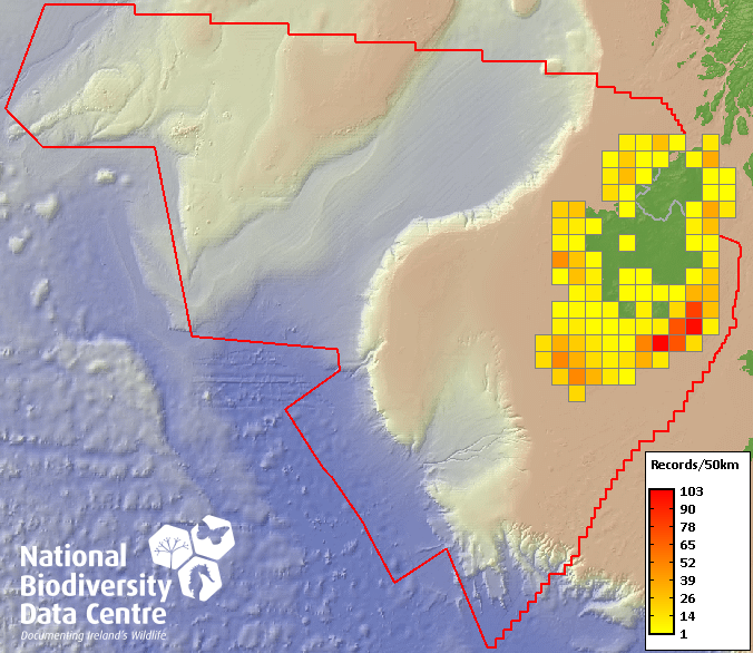 Distribution of the number of records recorded within each 10km grid square (ITM).Marine Map - 50km