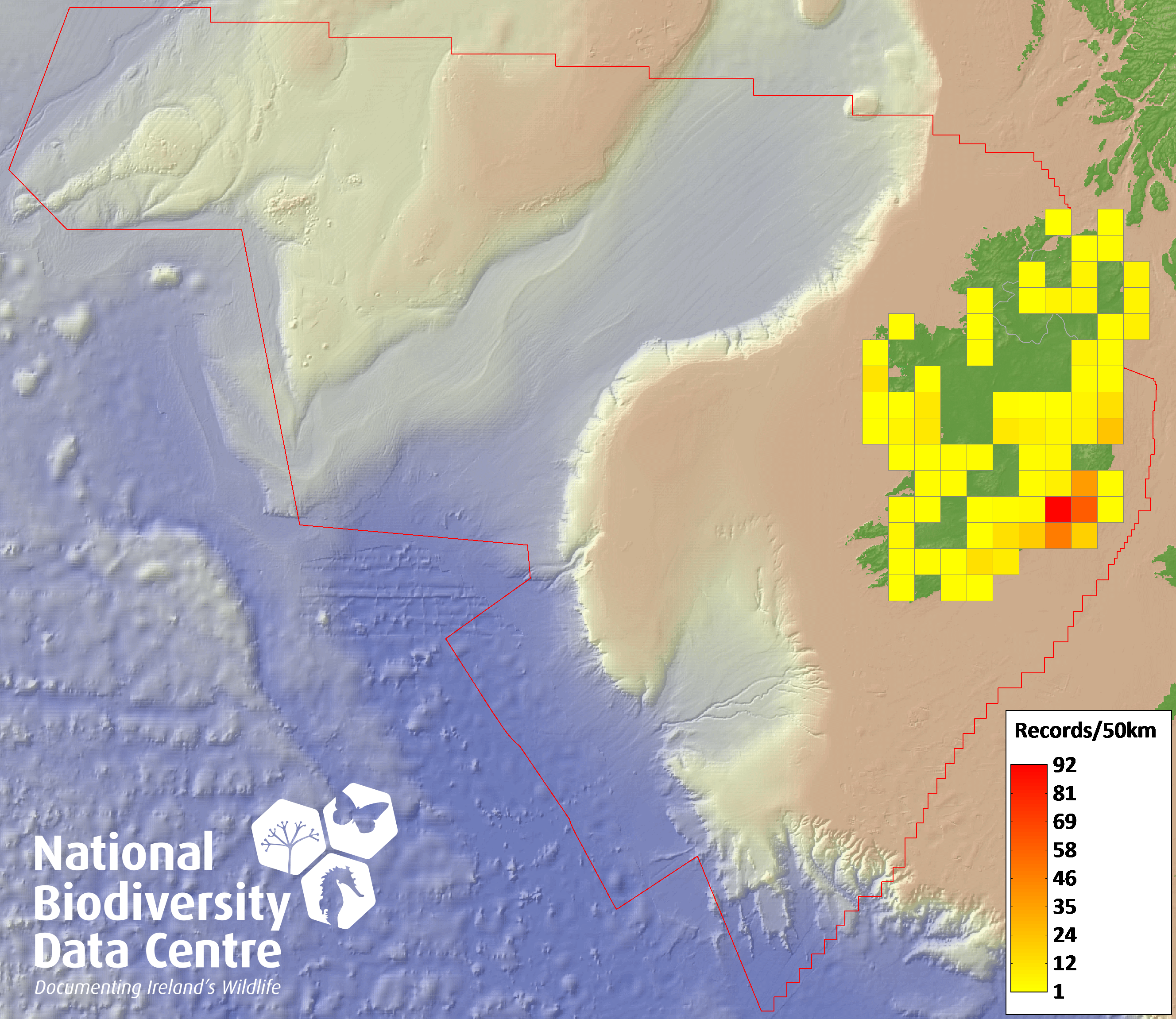 Distribution of the number of records recorded within each 10km grid square (ITM).Marine Map - 50km