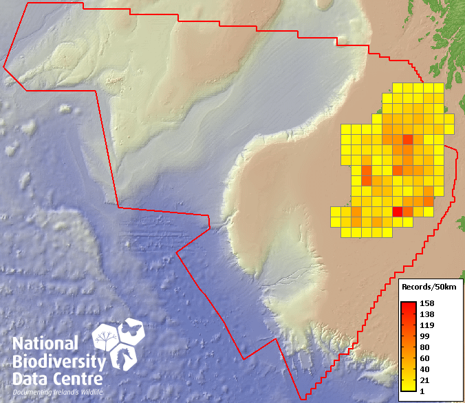 Distribution of the number of records recorded within each 10km grid square (ITM).Marine Map - 50km