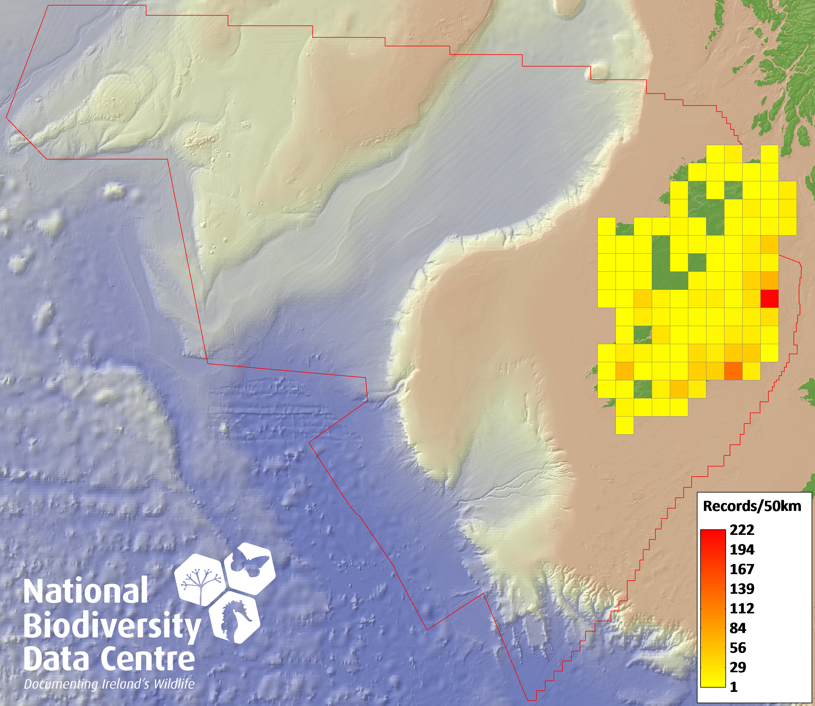 Distribution of the number of records recorded within each 10km grid square (ITM).Marine Map - 50km