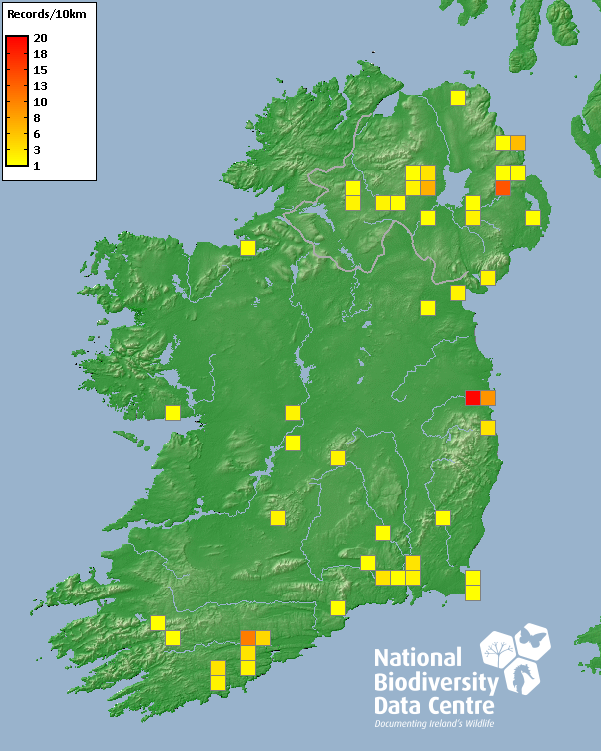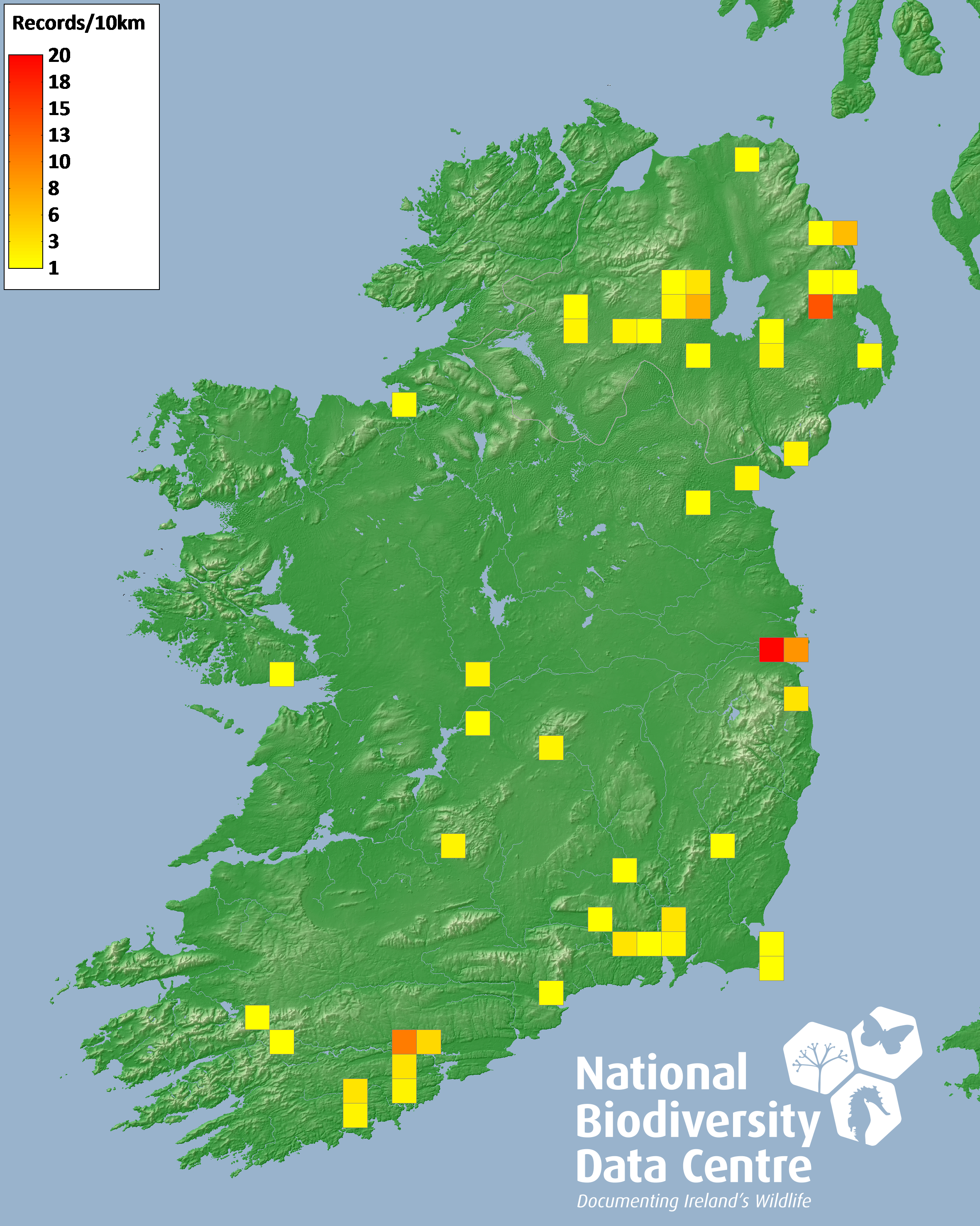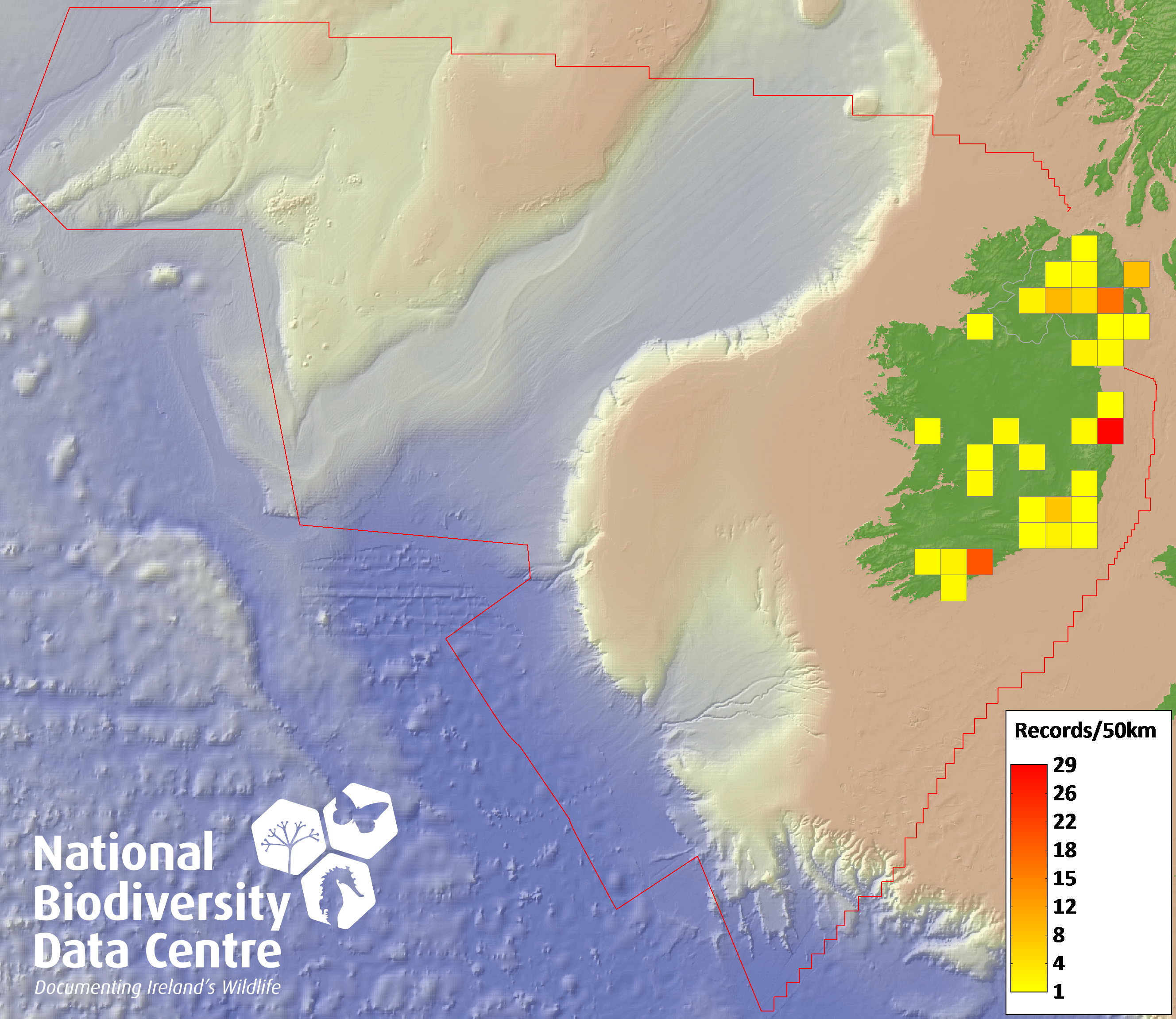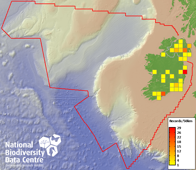 Distribution of the number of records recorded within each 10km grid square (ITM).Marine Map - 50km