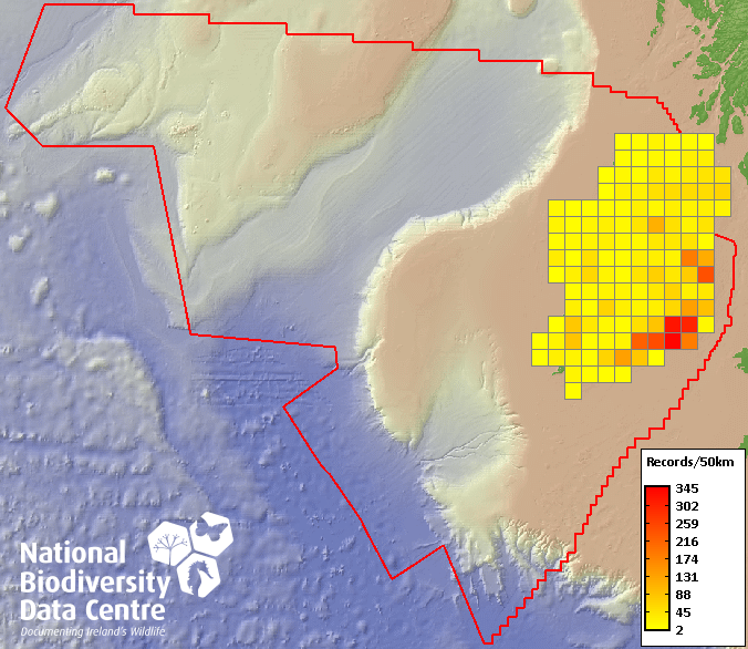 Distribution of the number of records recorded within each 10km grid square (ITM).Marine Map - 50km