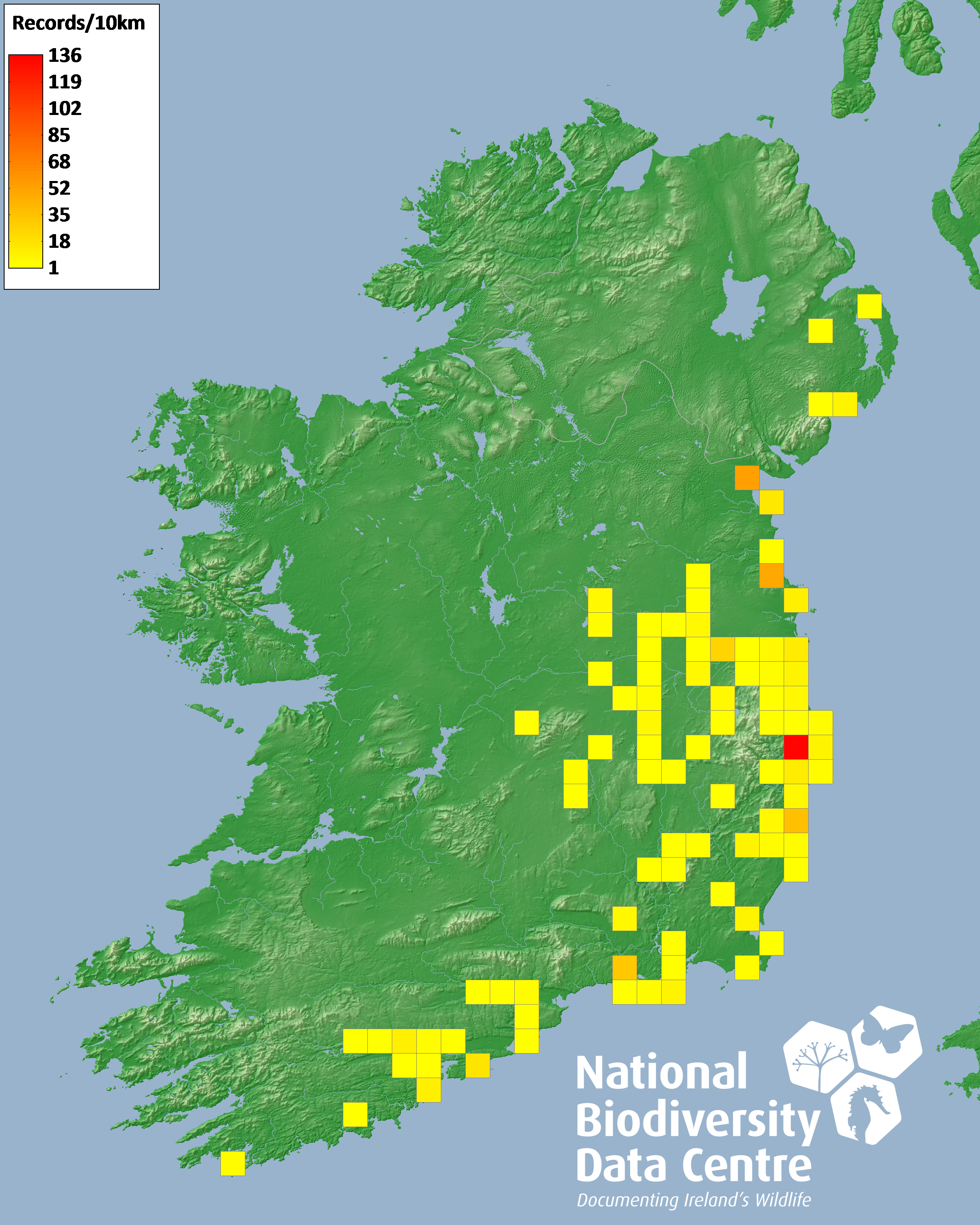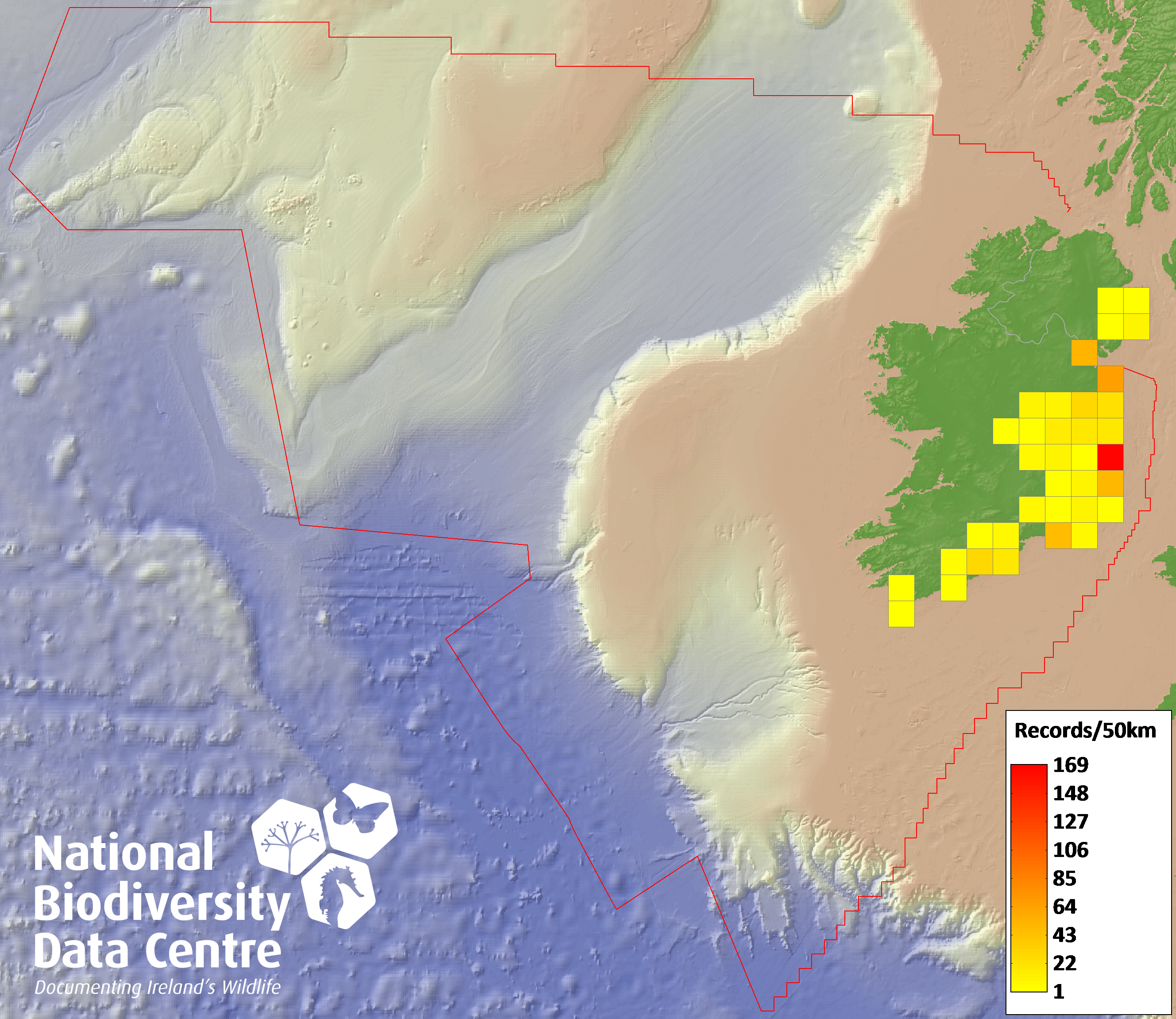 Distribution of the number of records recorded within each 10km grid square (ITM).Marine Map - 50km
