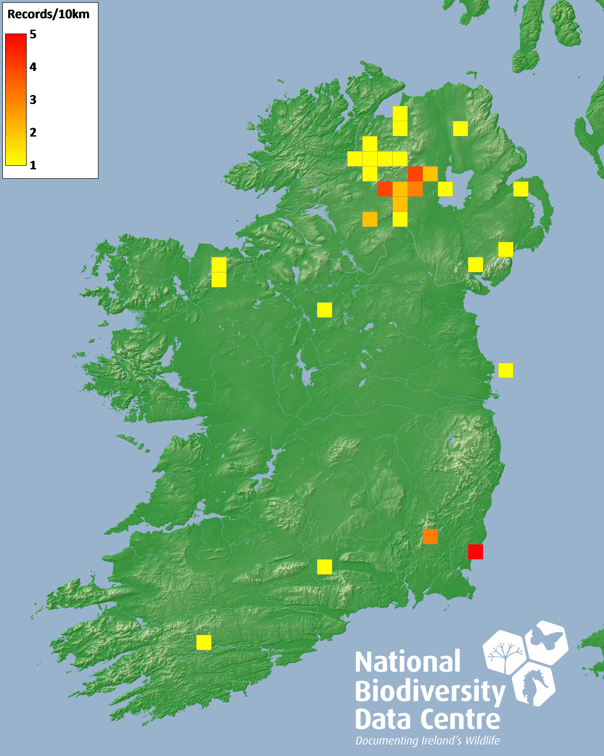 Distribution of the number of records recorded within each 10km grid square (ITM).Marine Map - 50km