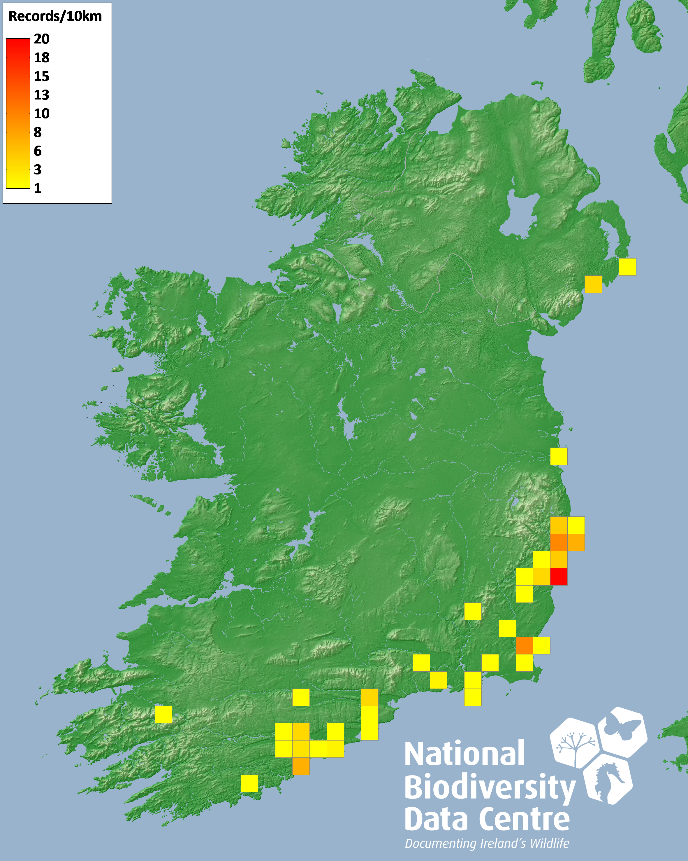 Distribution of the number of records recorded within each 10km grid square (ITM).Marine Map - 50km