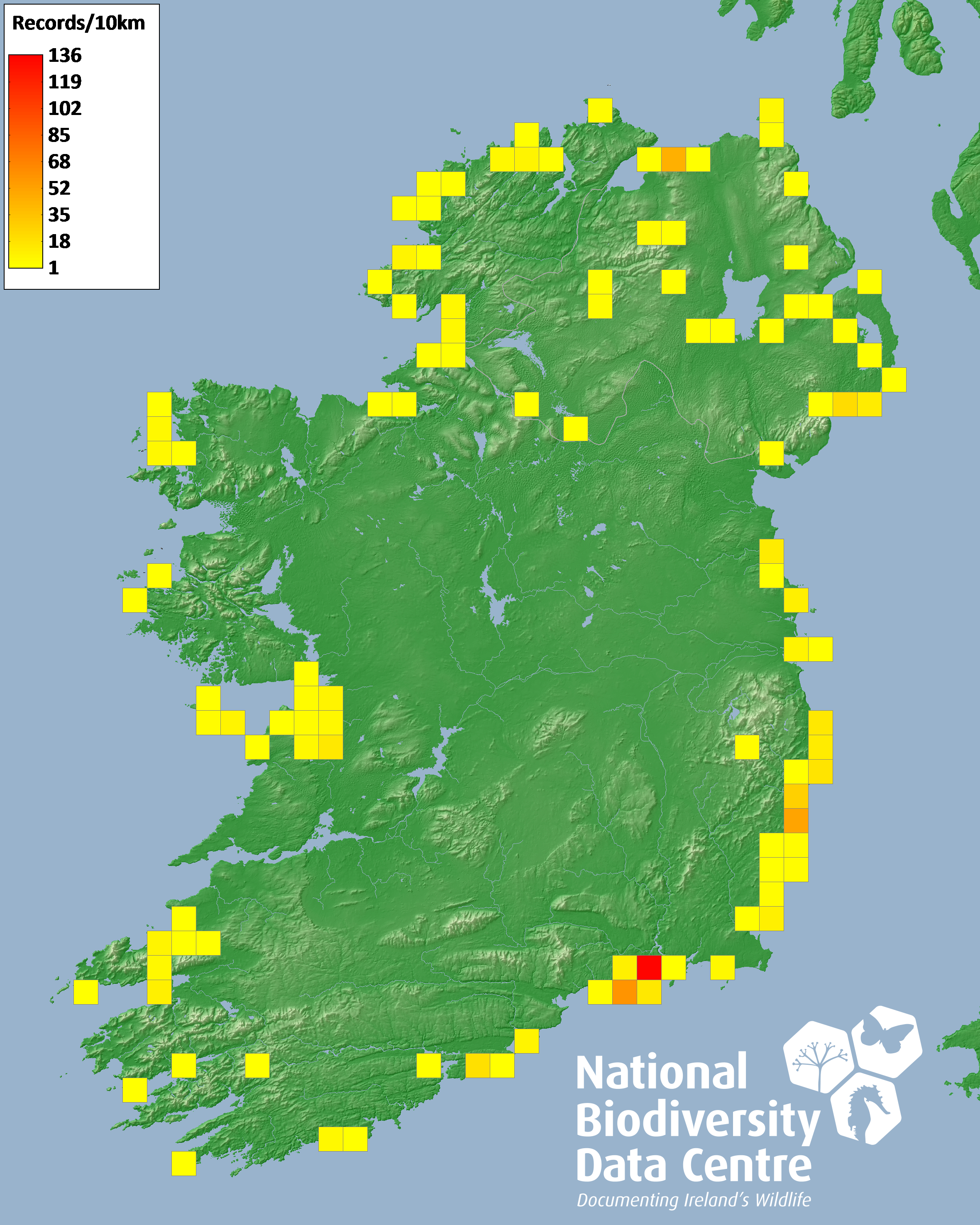 Distribution of the number of records recorded within each 10km grid square (ITM).Marine Map - 50km