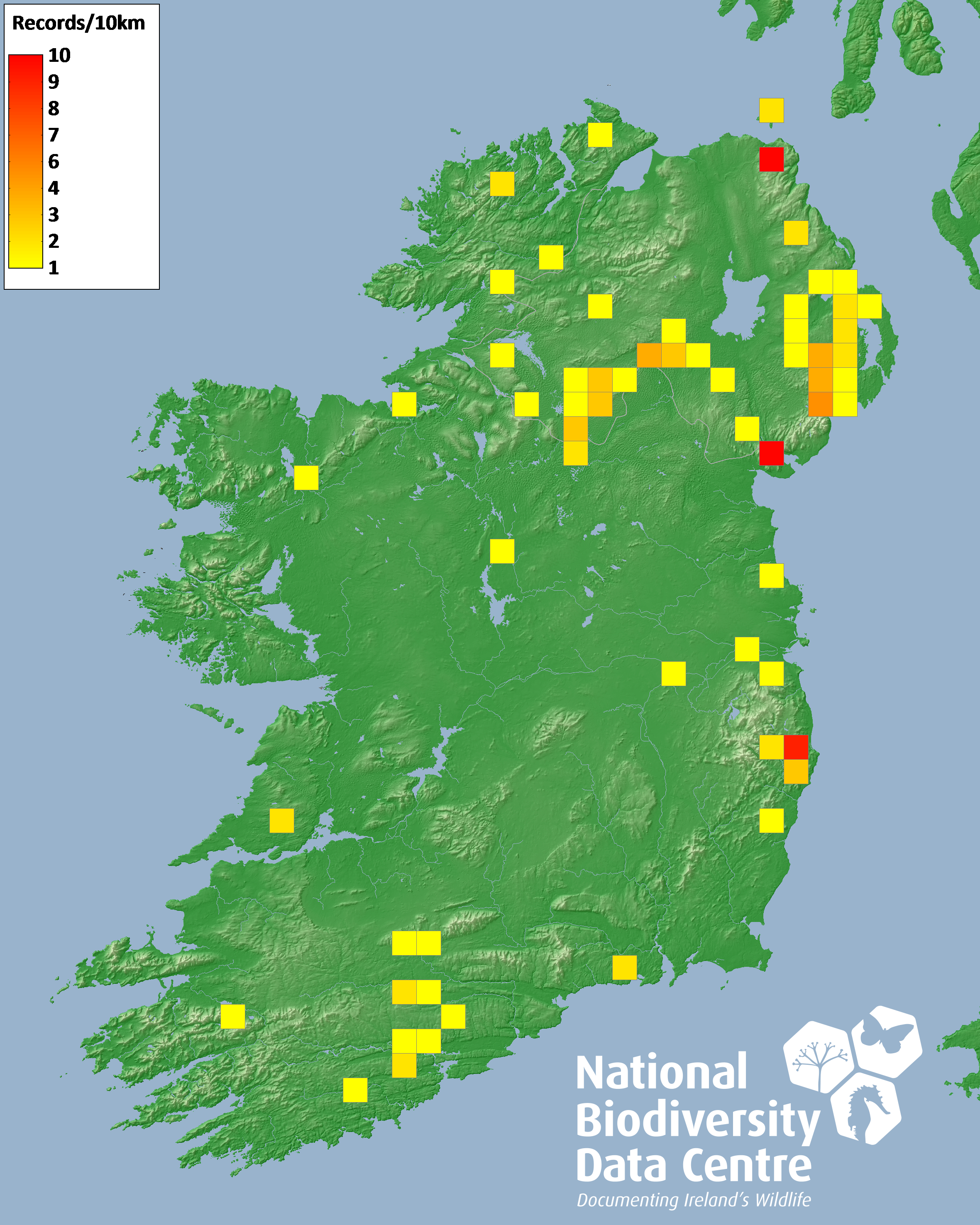 Distribution of the number of records recorded within each 10km grid square (ITM).Marine Map - 50km