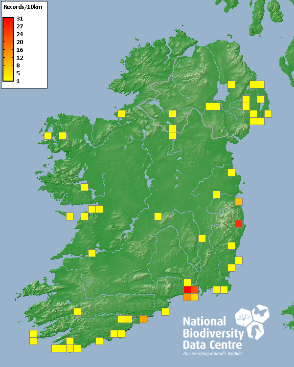 Distribution of the number of records recorded within each 10km grid square (ITM).Marine Map - 50km