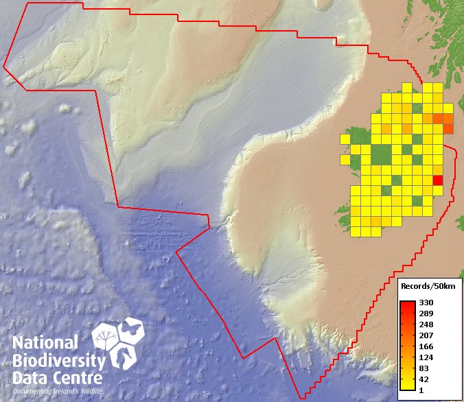 Distribution of the number of records recorded within each 10km grid square (ITM).Marine Map - 50km