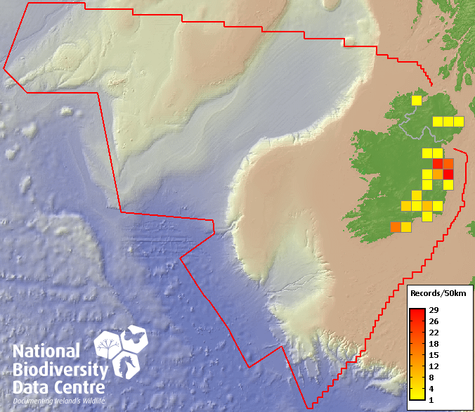 Distribution of the number of records recorded within each 10km grid square (ITM).Marine Map - 50km