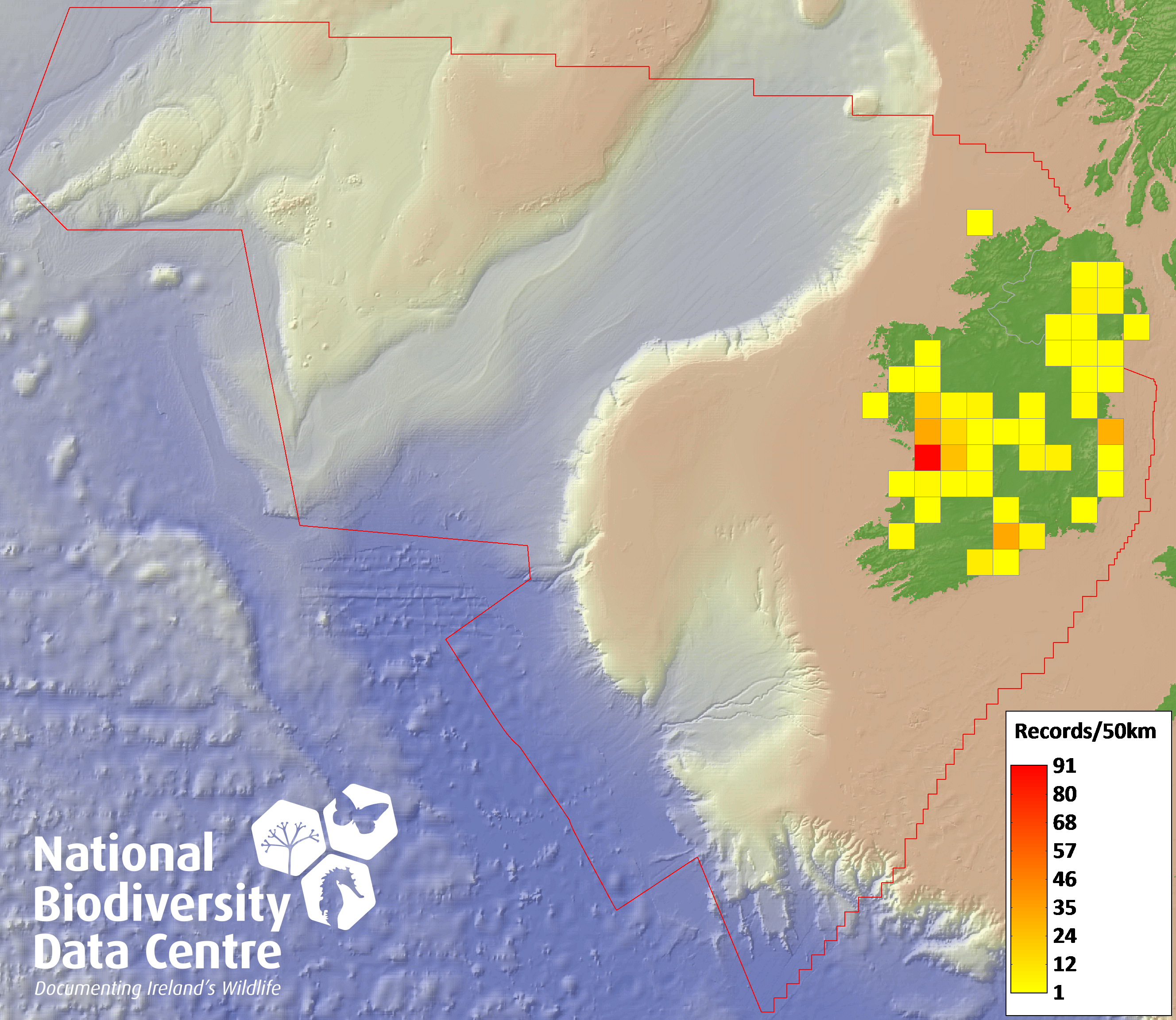Distribution of the number of records recorded within each 10km grid square (ITM).Marine Map - 50km