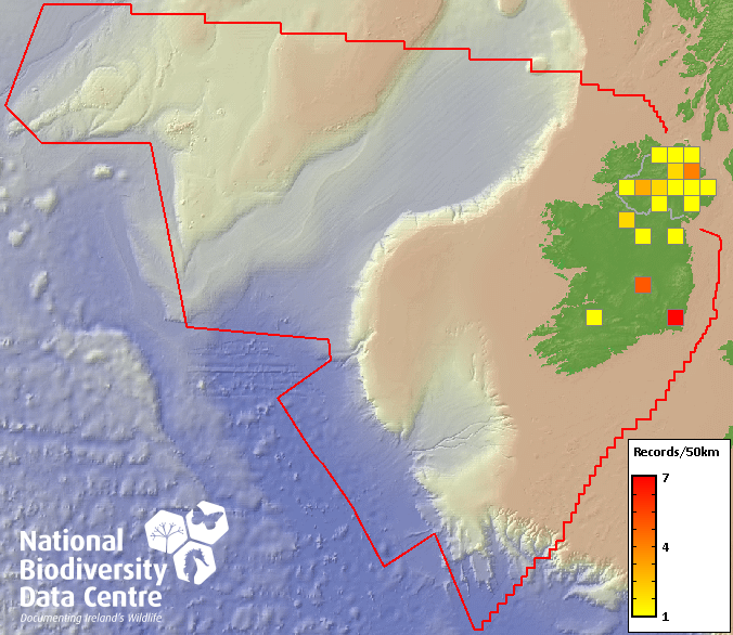 Distribution of the number of records recorded within each 10km grid square (ITM).Marine Map - 50km