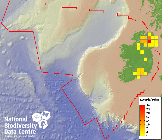 Distribution of the number of records recorded within each 10km grid square (ITM).Marine Map - 50km
