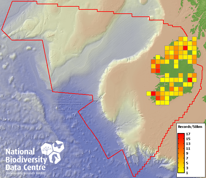 Distribution of the number of records recorded within each 10km grid square (ITM).Marine Map - 50km