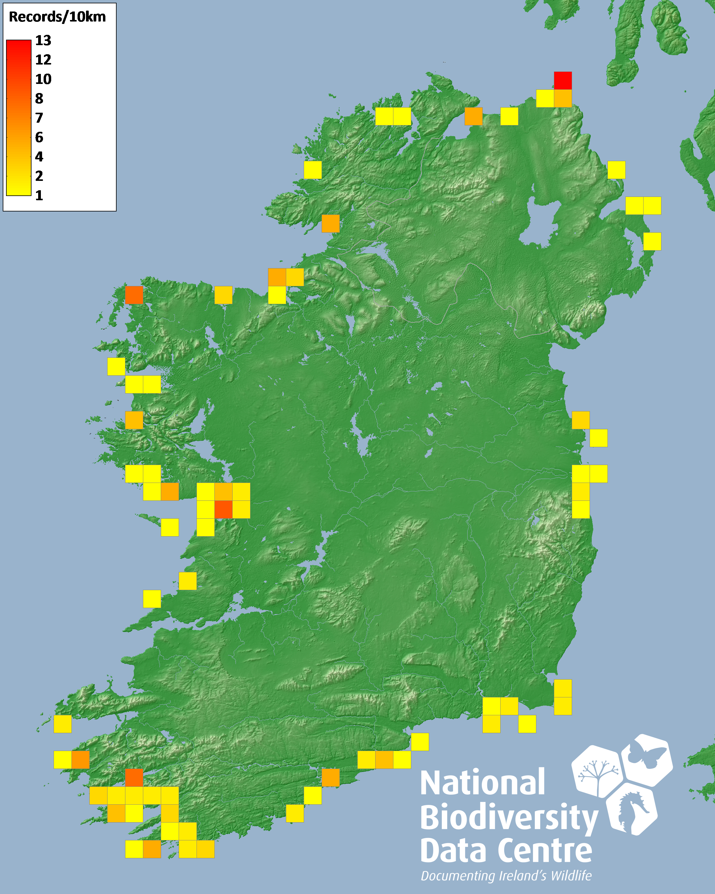 Distribution of the number of records recorded within each 10km grid square (ITM).Marine Map - 50km