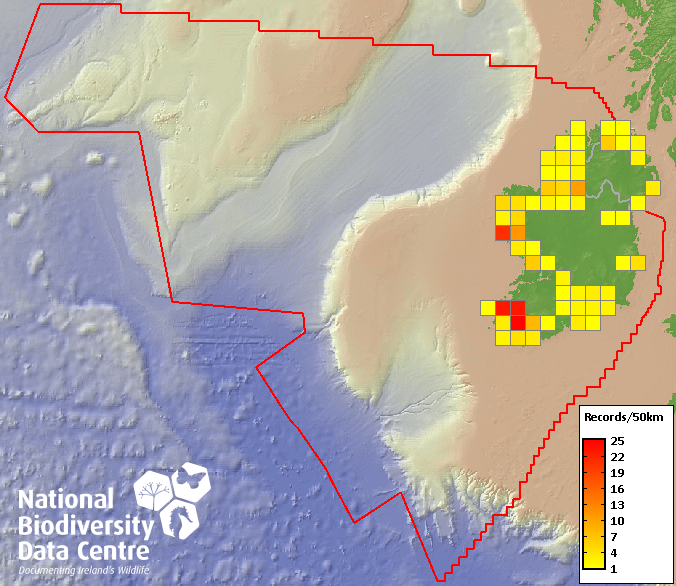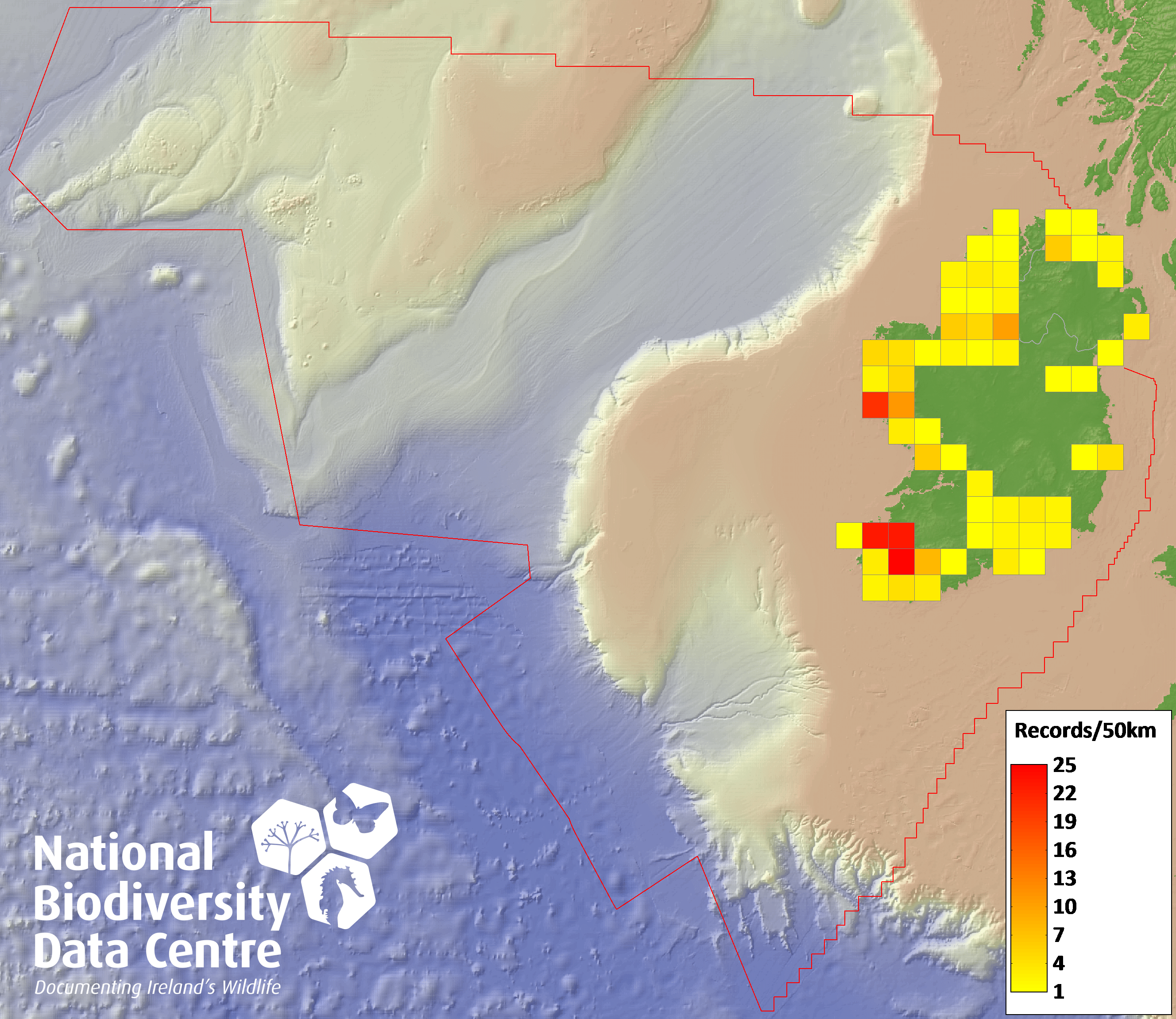 Distribution of the number of records recorded within each 10km grid square (ITM).Marine Map - 50km