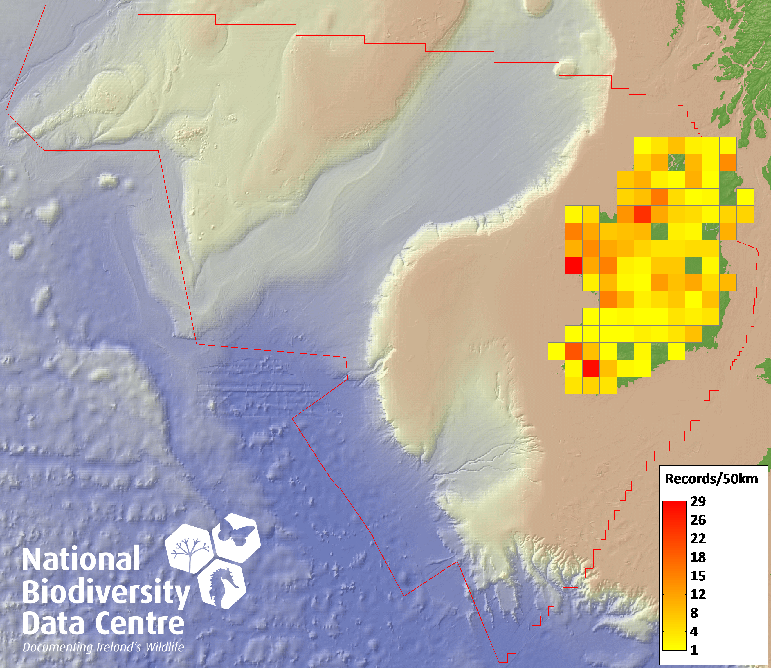 Distribution of the number of records recorded within each 10km grid square (ITM).Marine Map - 50km