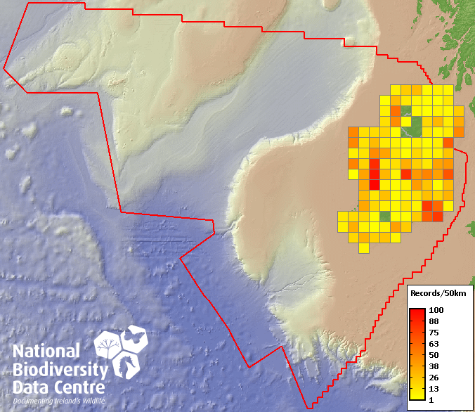 Distribution of the number of records recorded within each 10km grid square (ITM).Marine Map - 50km