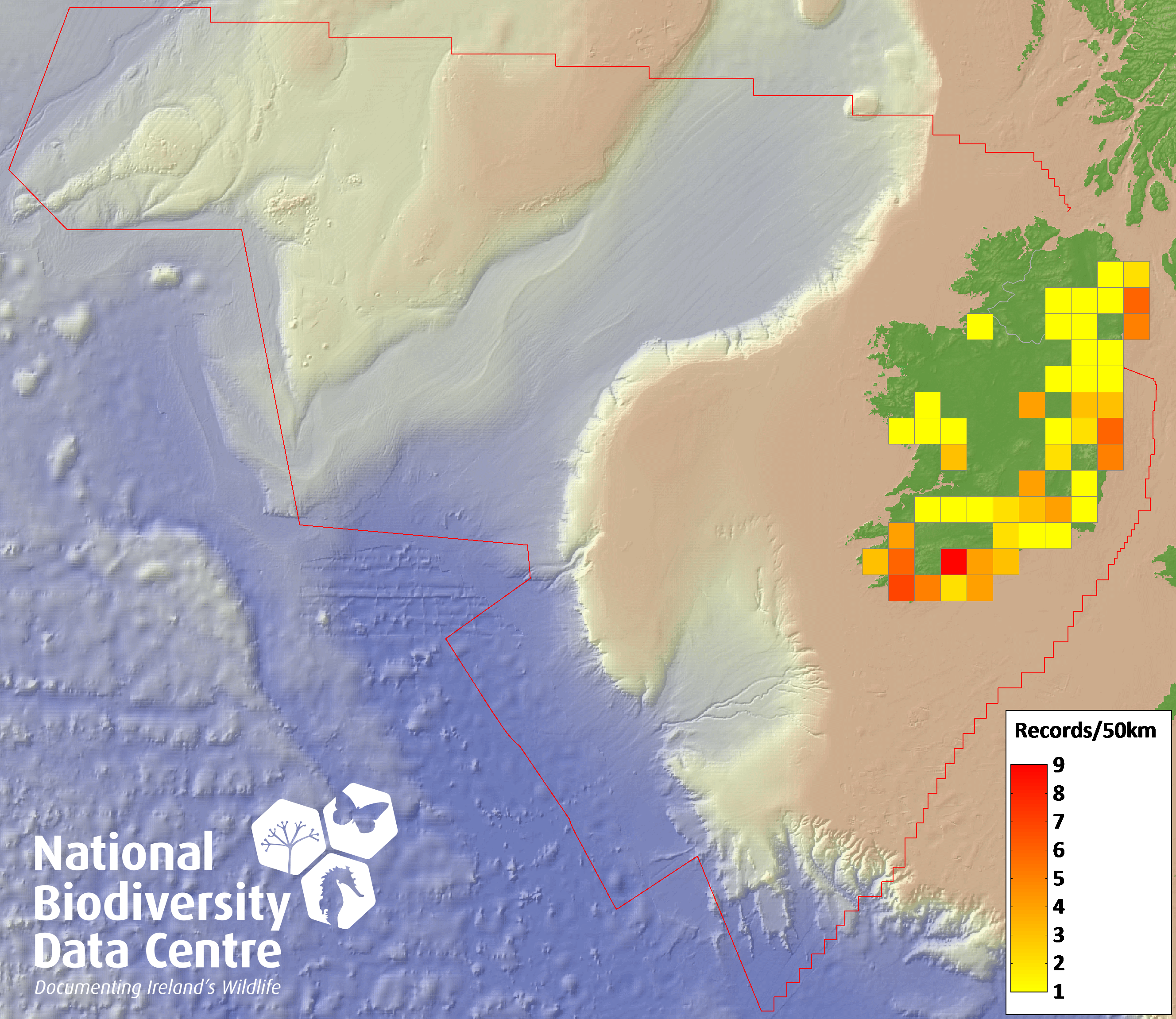 Distribution of the number of records recorded within each 10km grid square (ITM).Marine Map - 50km