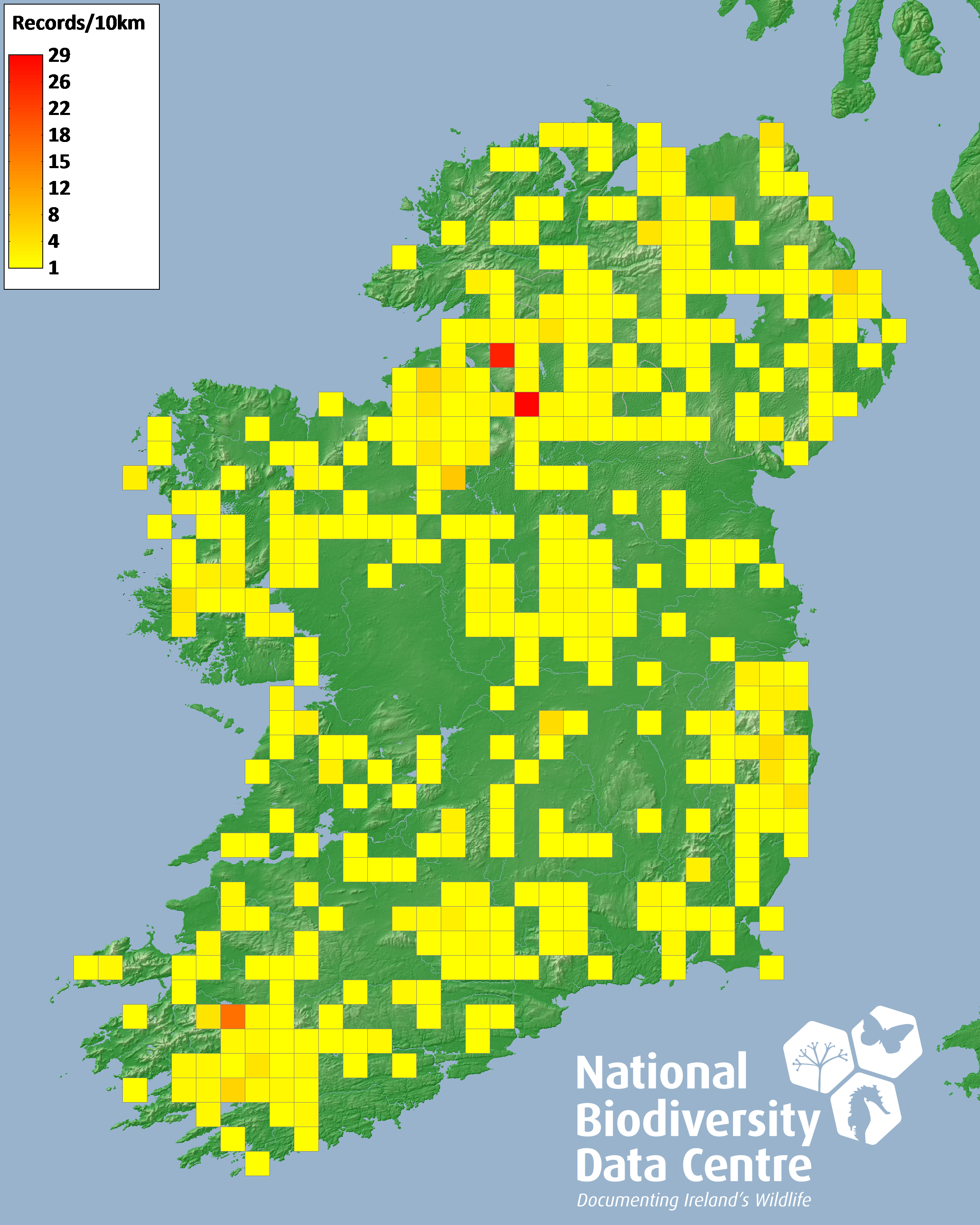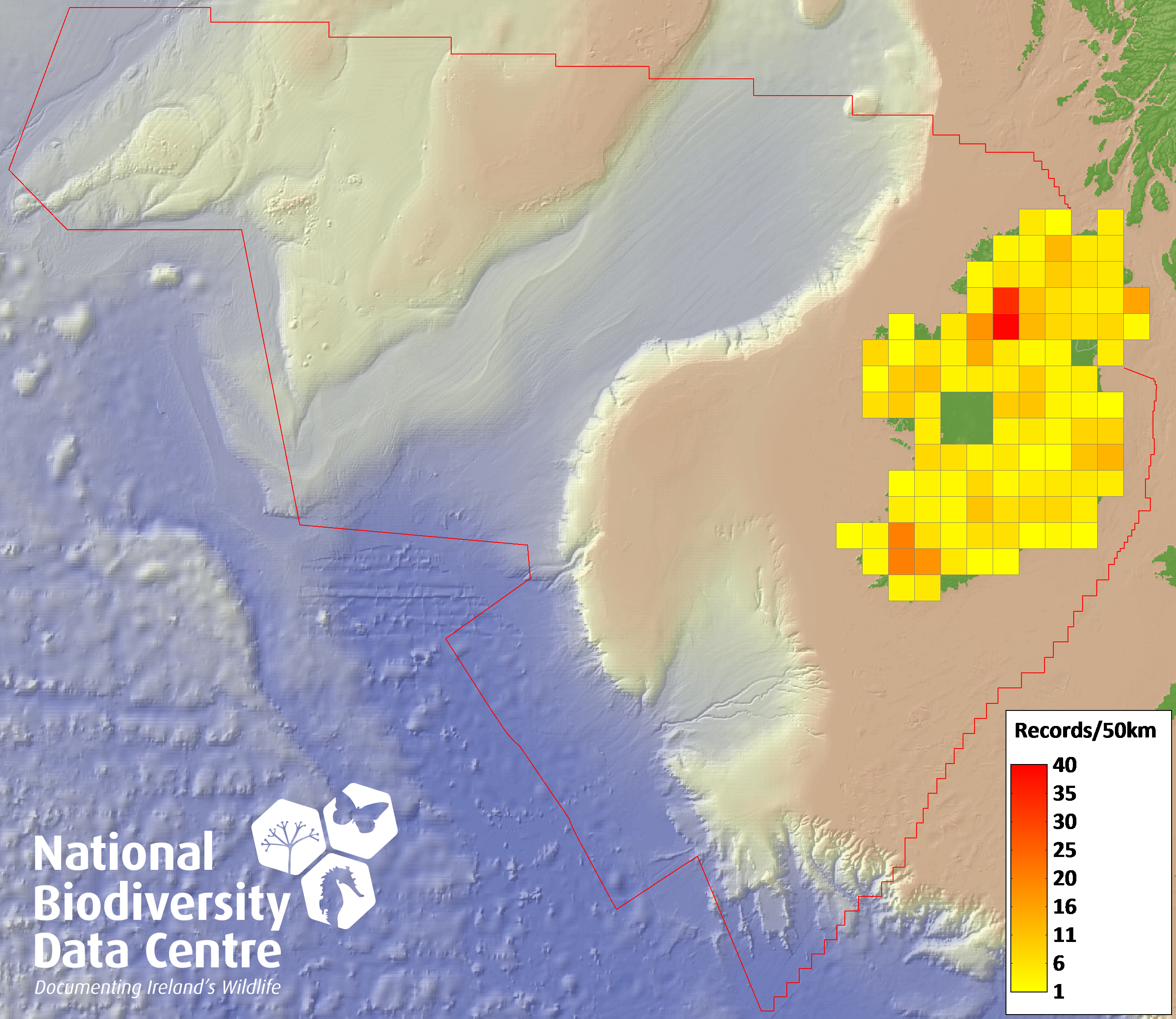Distribution of the number of records recorded within each 10km grid square (ITM).Marine Map - 50km