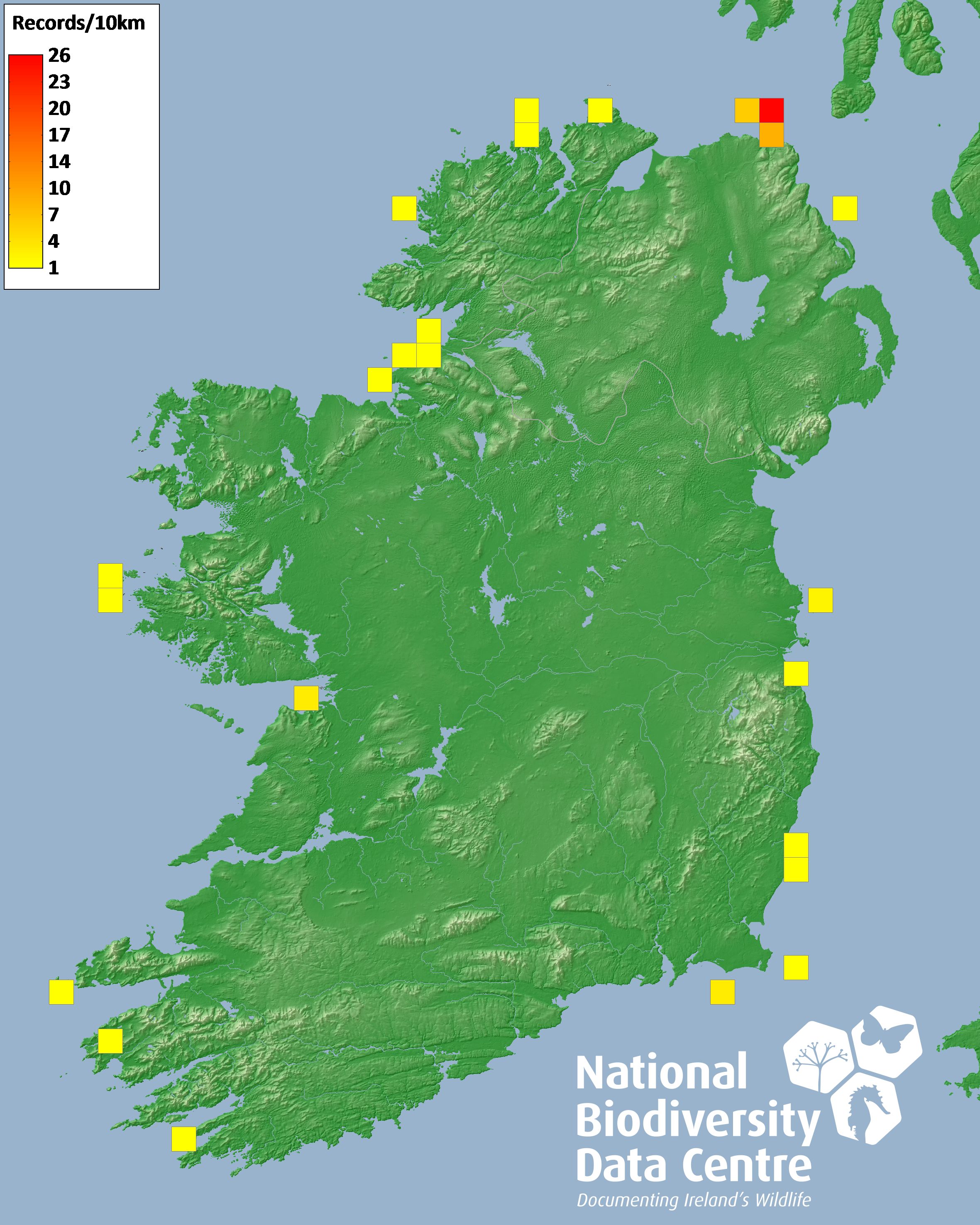 Distribution of the number of records recorded within each 10km grid square (ITM).Marine Map - 50km