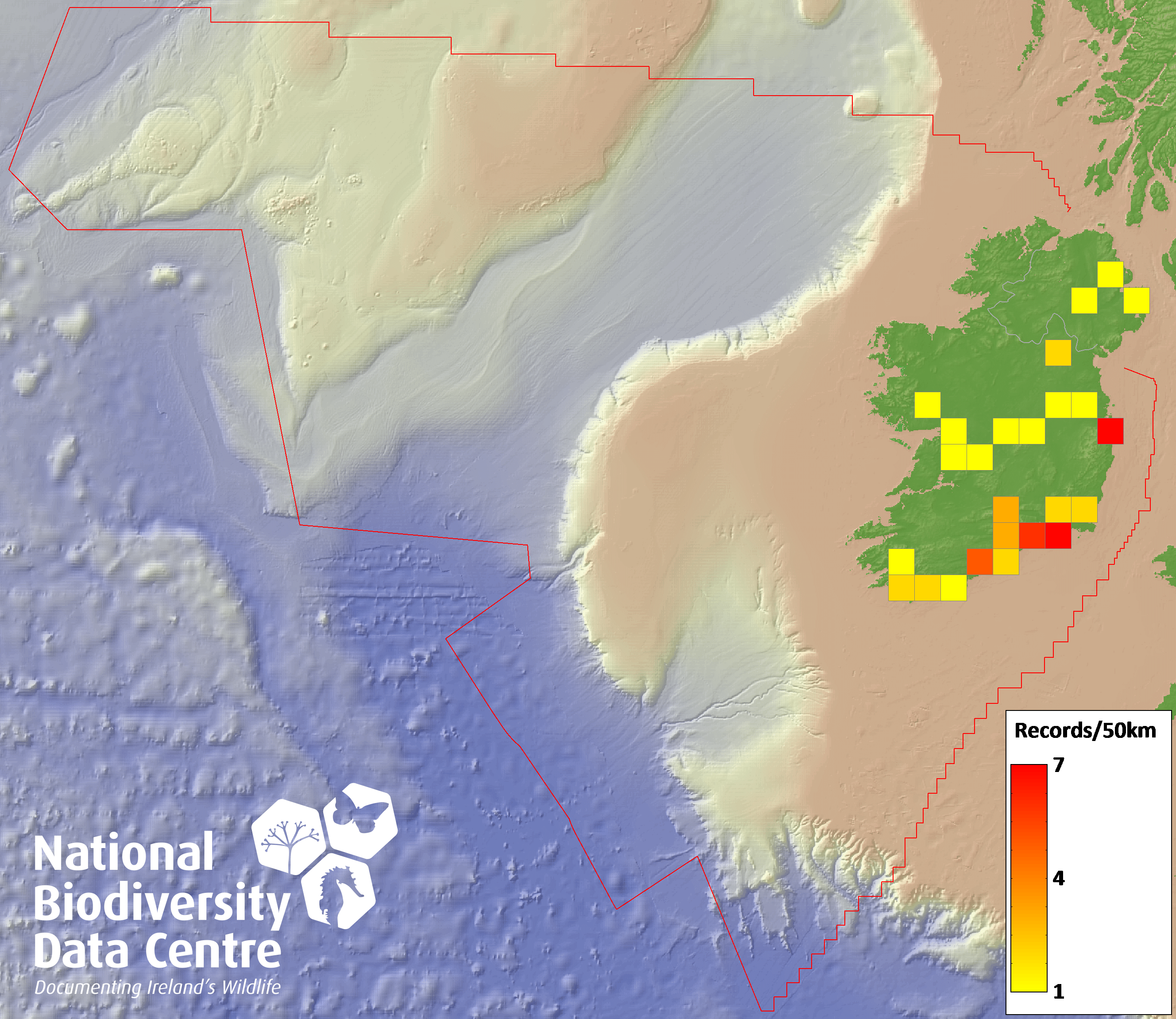 Distribution of the number of records recorded within each 10km grid square (ITM).Marine Map - 50km