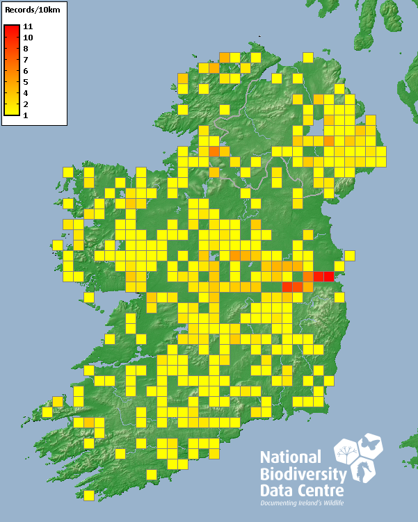 Distribution of the number of records recorded within each 10km grid square (ITM).Marine Map - 50km