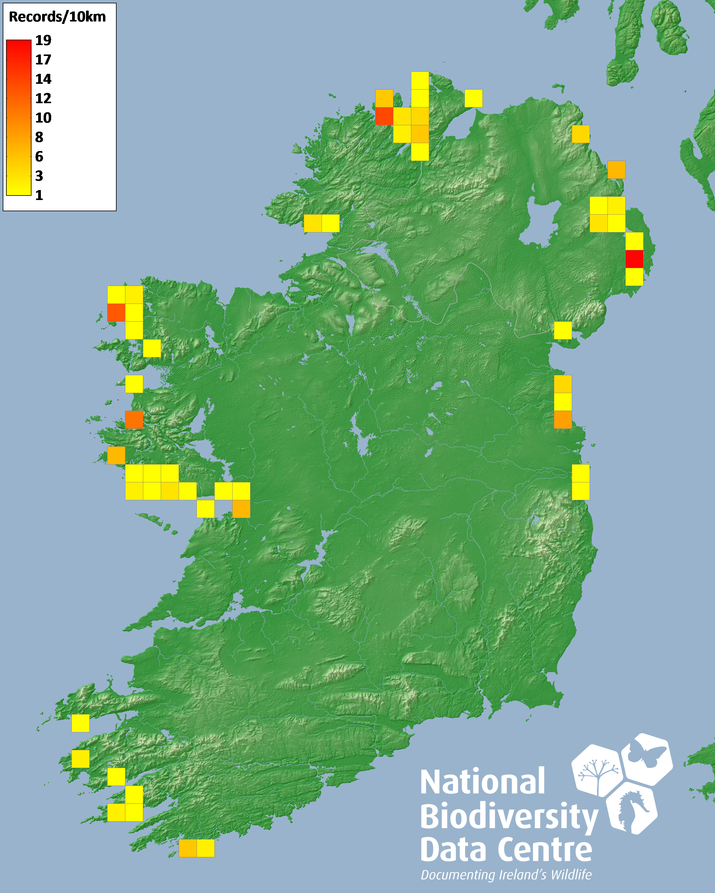 Distribution of the number of records recorded within each 10km grid square (ITM).Marine Map - 50km