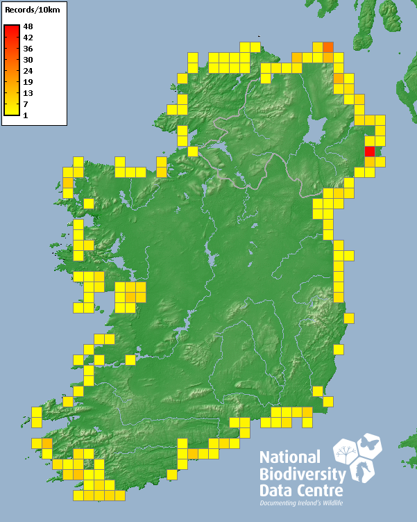 Distribution of the number of records recorded within each 10km grid square (ITM).Marine Map - 50km