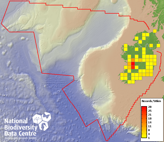 Distribution of the number of records recorded within each 10km grid square (ITM).Marine Map - 50km
