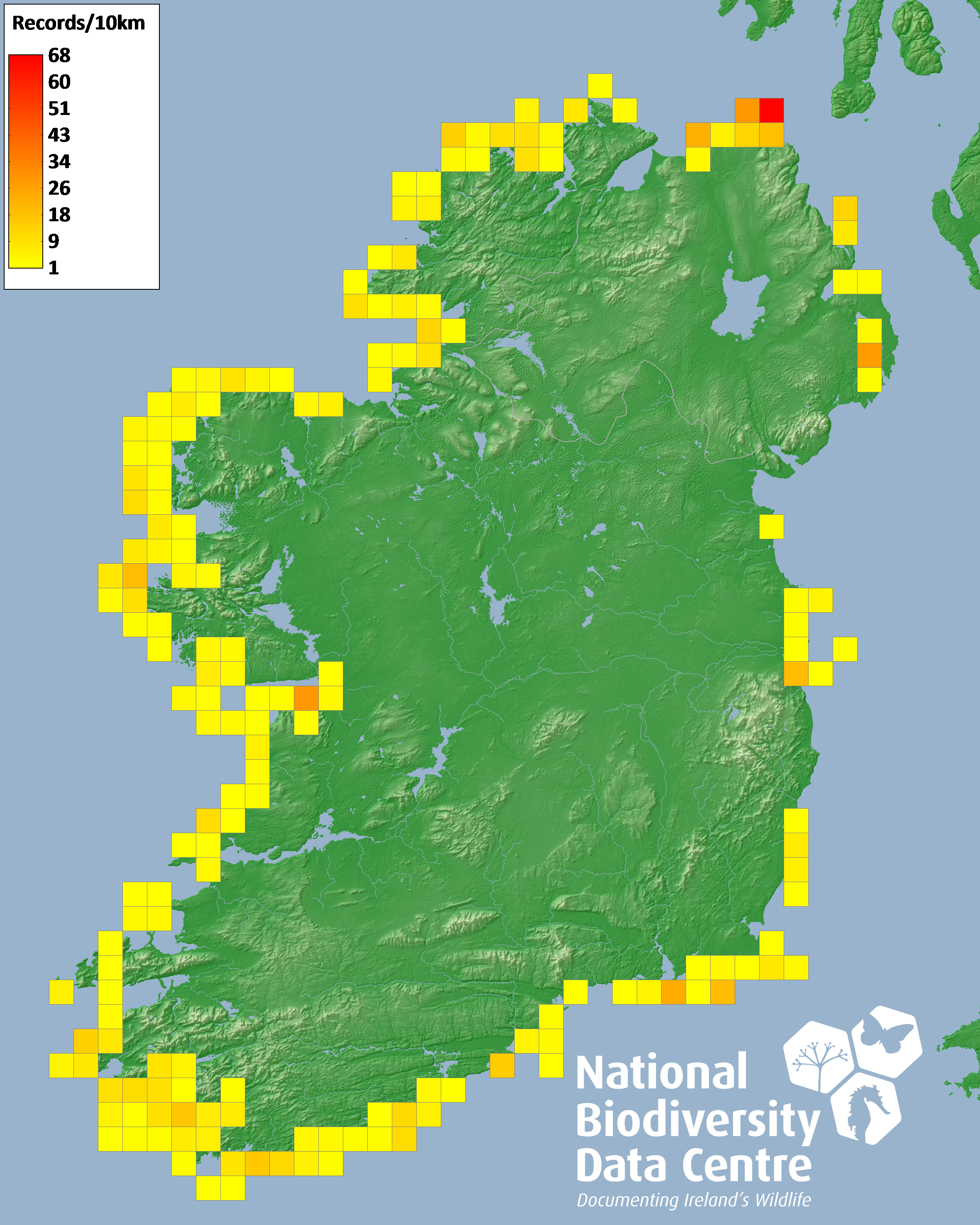Distribution of the number of records recorded within each 10km grid square (ITM).Marine Map - 50km