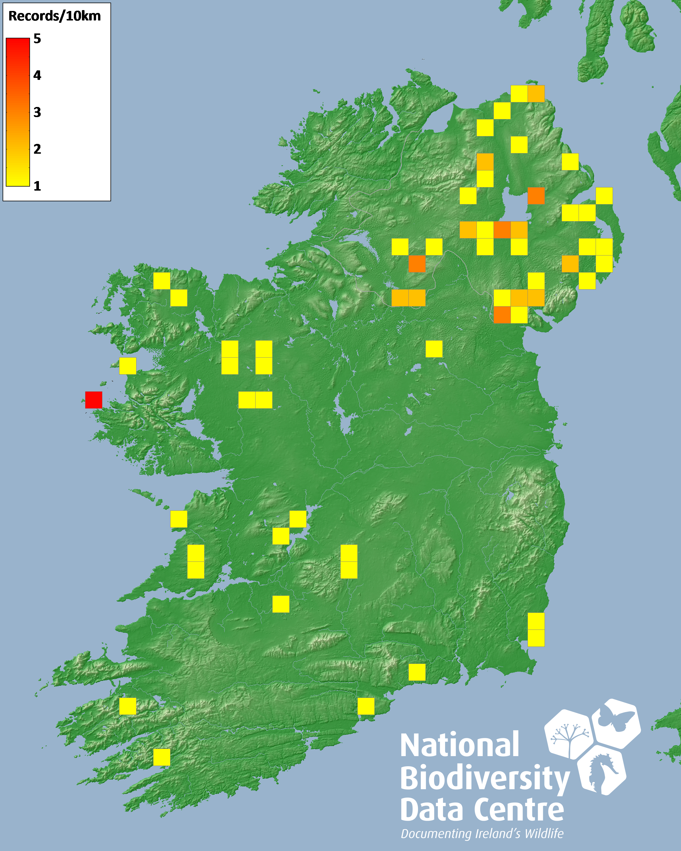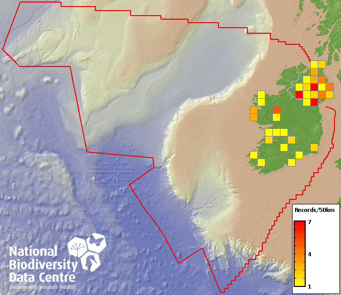 Distribution of the number of records recorded within each 10km grid square (ITM).Marine Map - 50km