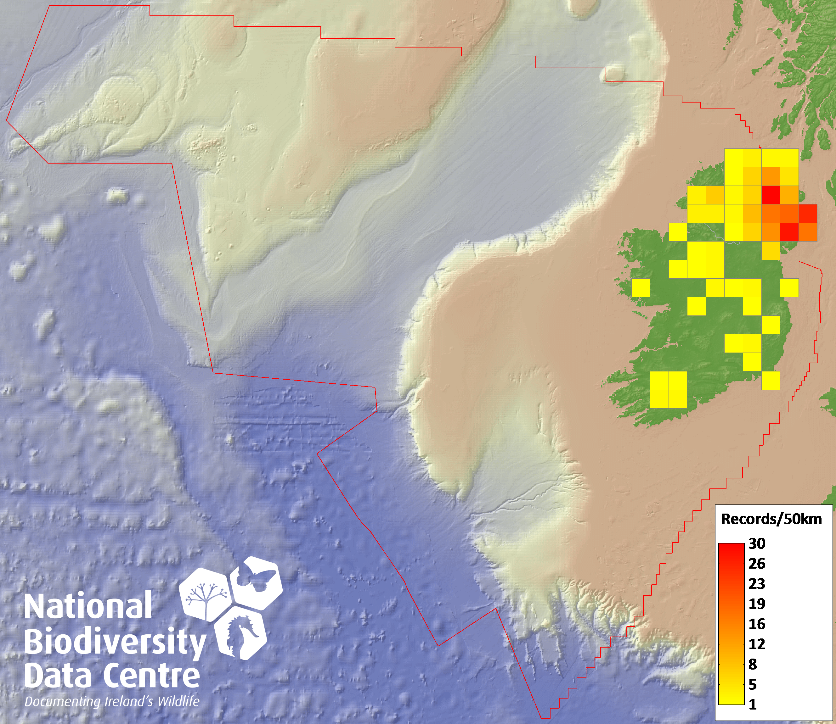 Distribution of the number of records recorded within each 10km grid square (ITM).Marine Map - 50km