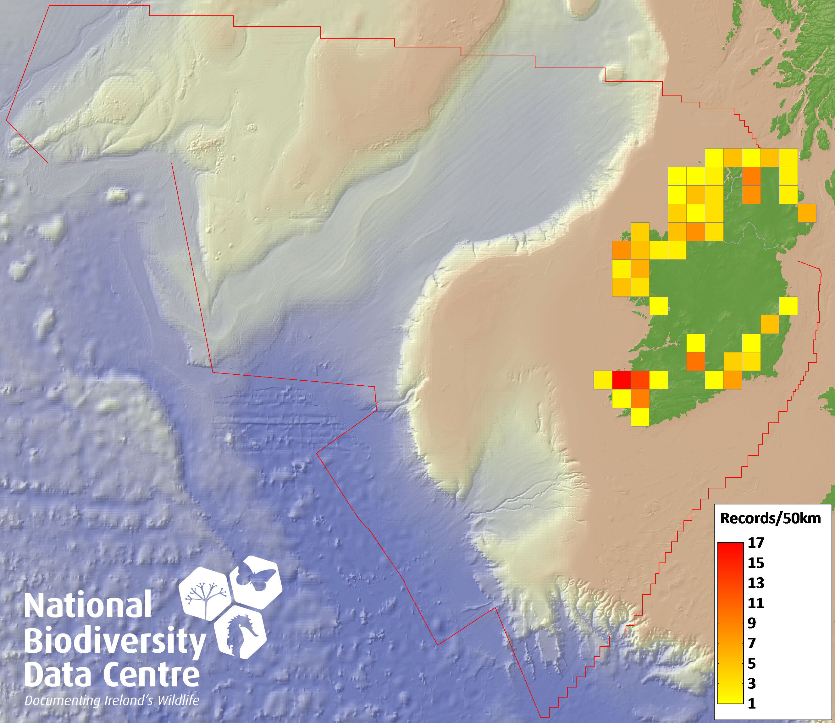 Distribution of the number of records recorded within each 10km grid square (ITM).Marine Map - 50km